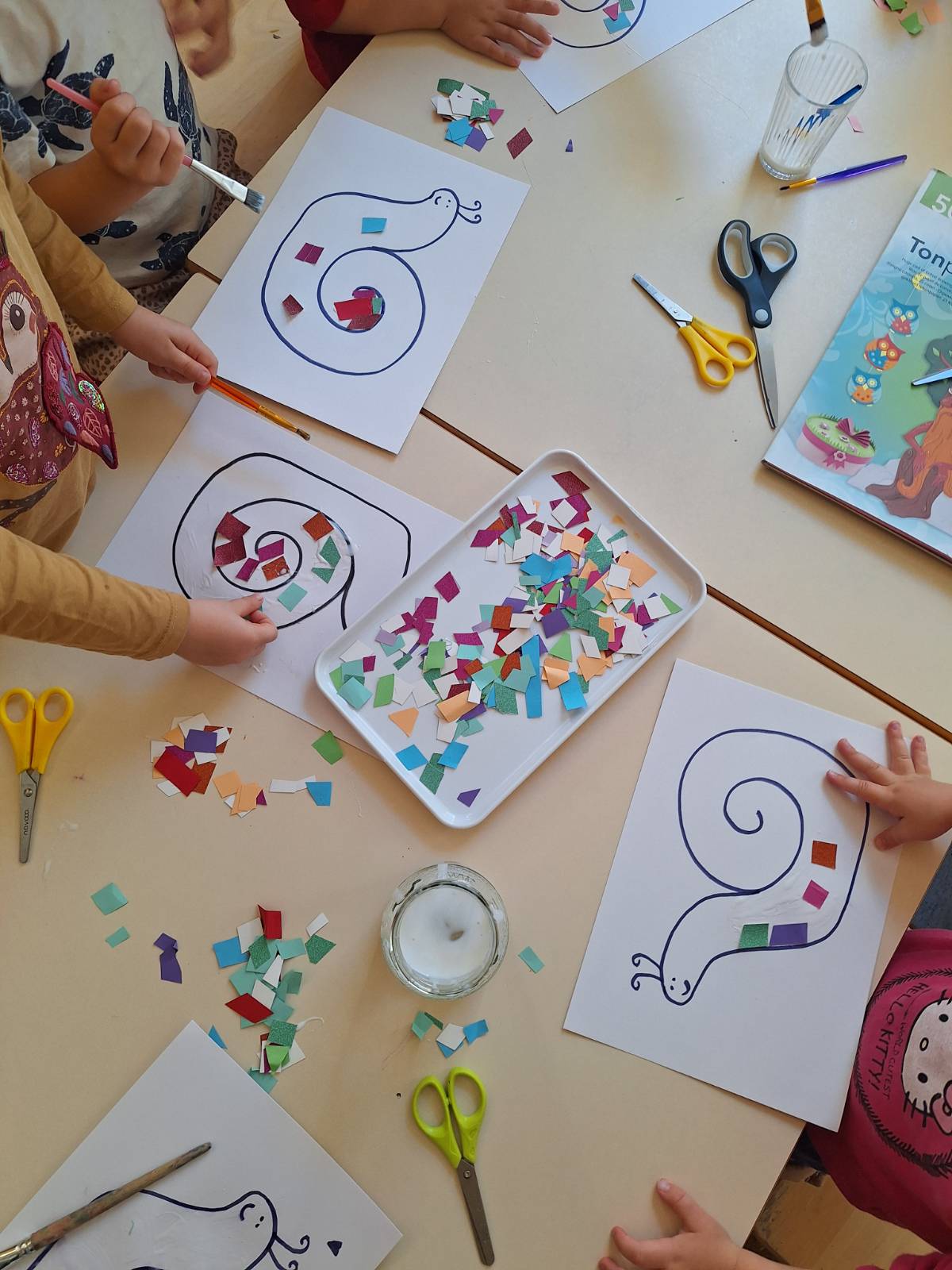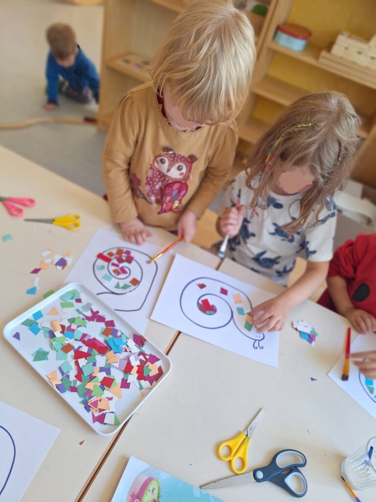 Jedes Kind durfte seine Schnecke mit vielen kleinen, farbenfrohen Papierresten bekleben. Mit Kleber, Pinsel und viel Freude sind wunderschöne Mosaik-Schnecken entstanden. Dabei konnten die Kinder ihre Kreativität ausleben, Farben ausprobieren und ihre Feinmotorik üben.