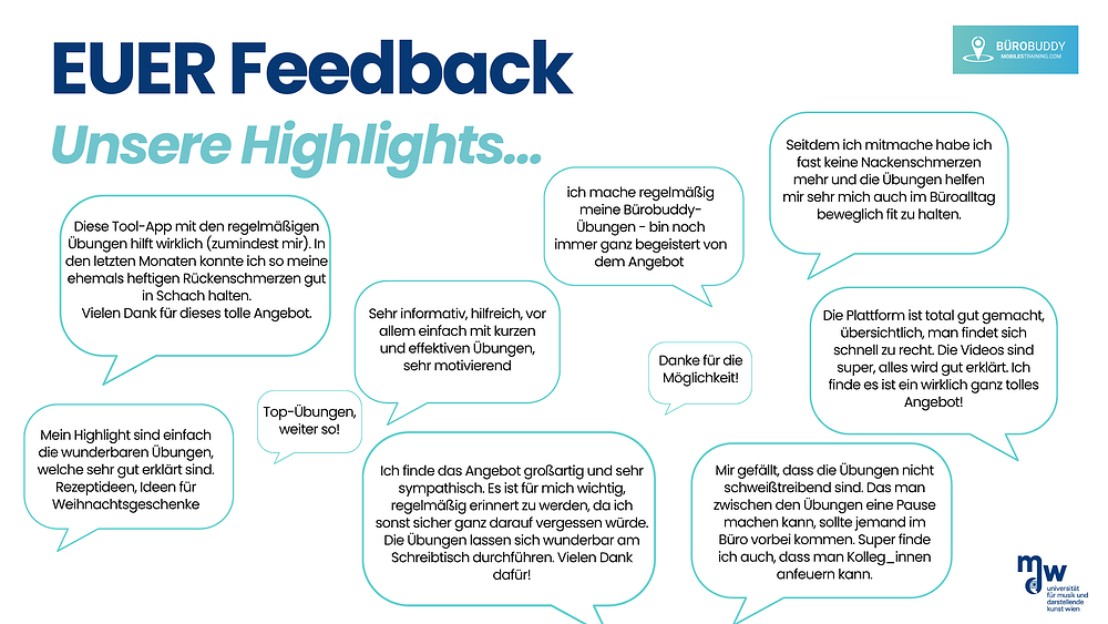 An manchen Tagen fällt das wirklich schwer, aber spätestens vor dem nach Hause gehen denke ich noch einmal an das Programm und erledige noch etwaig offene BüroBuddy-Tagesübungen (Ehrgeizler!). Das Programm hat mir aber sicher dabei geholfen, bewusster auf meine Körperhaltung zu achten und das lange Sitzen öfter zu unterbrechen (auch ohne unbedingt ein BüroBuddy-Video zu schauen und bei Übungen mitzumachen).