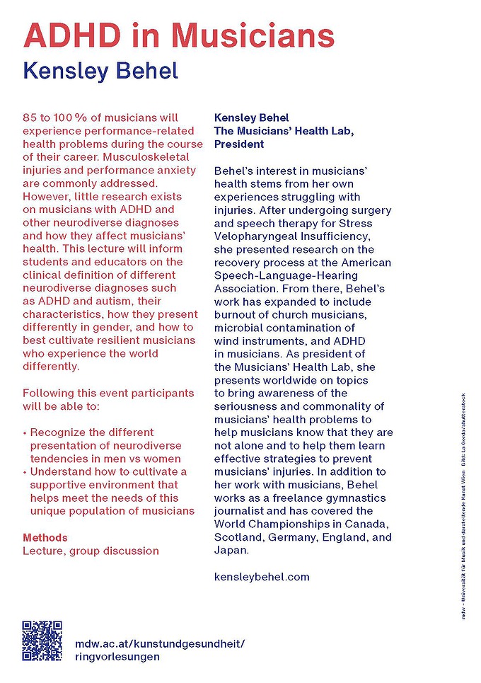 Die Unterschiede in der Leistungsfähigkeit zwischen männlichen und weiblichen Körpern haben in den letzten Jahren in verschiedensten Bereichen erhöhte Aufmerksamkeit erhalten. Doch welche Einflüsse haben Menstruationszyklus, Hormonpille, etc. auf mentale und körperliche Leistungsfähigkeit? Im Sport hat man begonnen das Training der Spitzensportlerinnen auf ihren Menstruationszyklus abzustimmen und die hormonellen Einflüsse und Beschwerden bei der Vorbereitung auf Wettkämpfe soweit möglich zu beachten. Wie im Leistungssport muss auch in der Musik und im Tanz zu einem bestimmten Zeitpunkt die bestmögliche Performance abgerufen werden. Ein „schlechter Tag“ im eigenen Menstruationszyklus gilt dabei nicht als Ausrede. Es wird versucht bestmöglich mit körperlichen und mentalen Symptomen umzugehen anhand „Zyklustracking“ und wissenschaftlichen Erkenntnissen. Dabei bestehen Diskrepanzen zwischen wissenschaftlichen Empfehlungen und üblichen Anwendungen in der Praxis (Nahrungsergänzungsmittel, Hormoneinnahme etc.). Das junge Forschungsfeld der Zyklusforschung birgt einige Herausforderungen, die in diesem Vortrag behandelt werden.