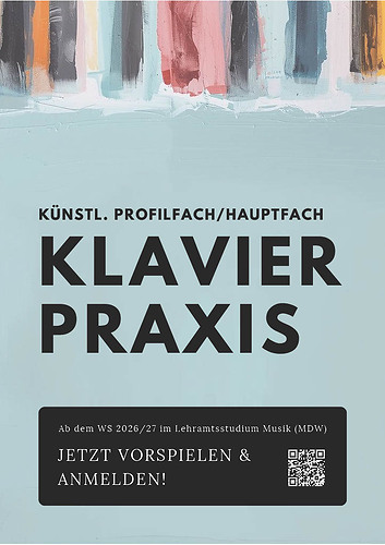Ab dem Wintersemester 2026/27 ist es möglich, im Rahmen des Lehramtsstudiums Musik an der mdw das künstlerische Profilfach (Hauptfach) „Klavierpraxis" zu wählen. Dieses neue künstlerische Profilfach ist eine inhaltliche Verschränkung des Schulpraktischen Klavierspiels (v. a. improvisierte Liedbegleitung, Klavier und Stimme, Anleiten von Musizierprozessen) mit dem Literaturspiel (Interpretation von Stücken verschiedenster Genres und Stilrichtungen). Das Profil zielt darauf ab, musikalische Vielseitigkeit, künstlerischen Anspruch und schulpraktische Aspekte in Beziehung zueinander zu bringen und ermöglicht den Studierenden besonders individuelle Schwerpunktsetzungen.
