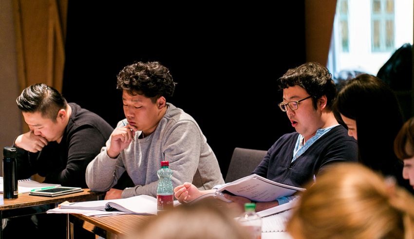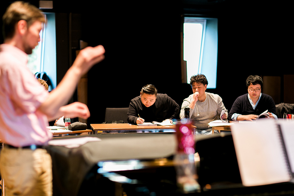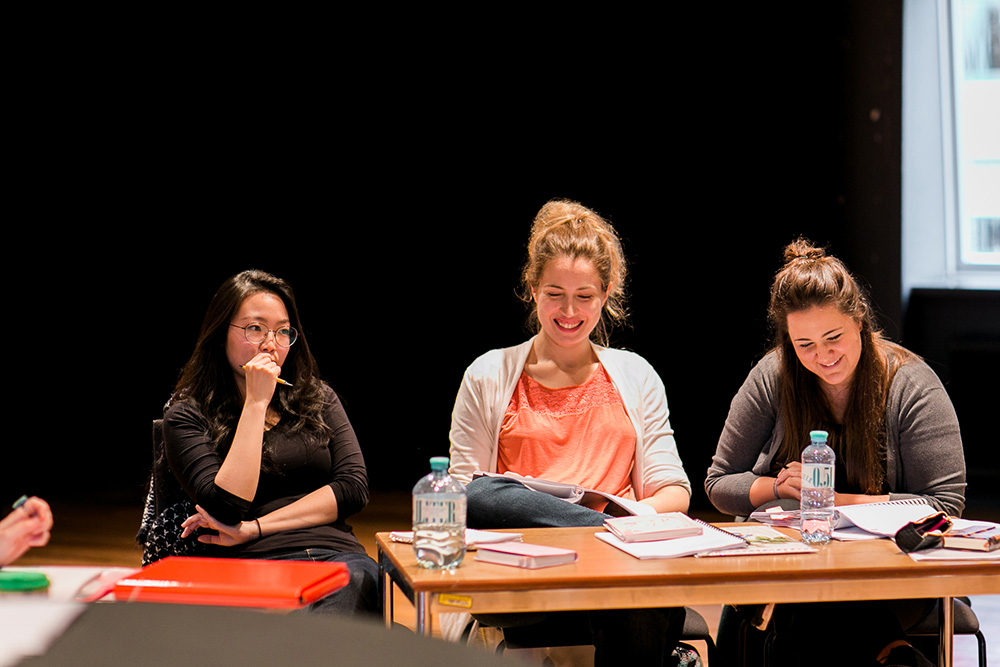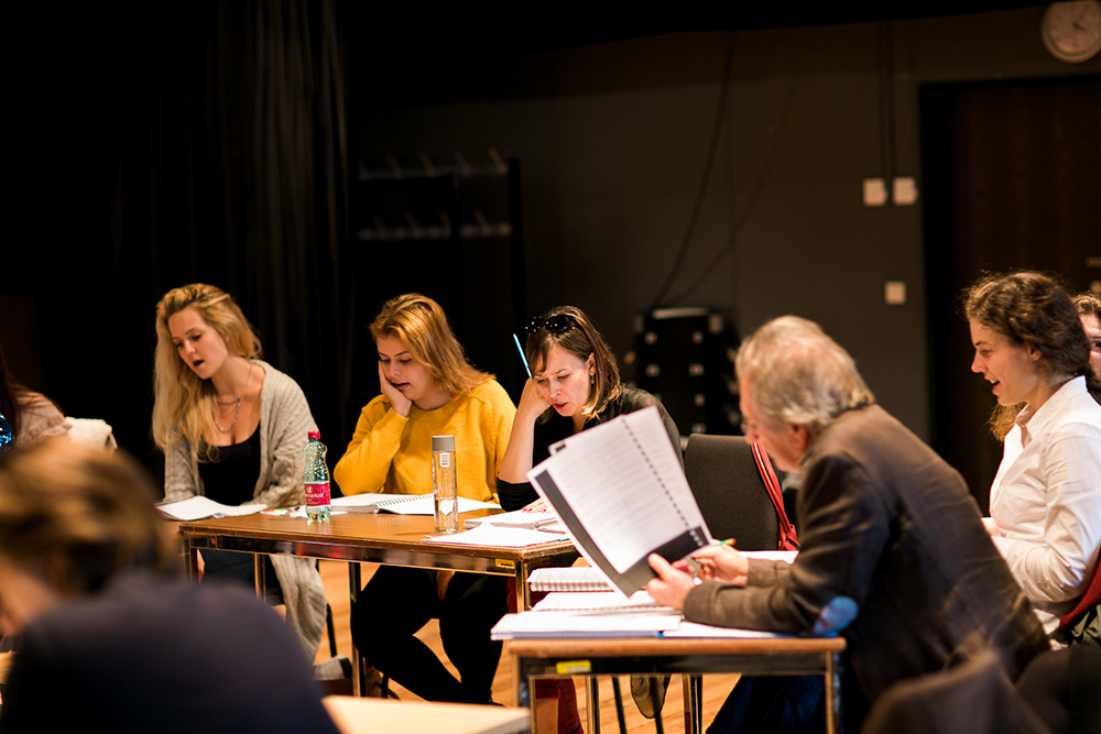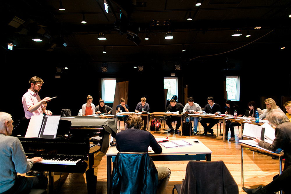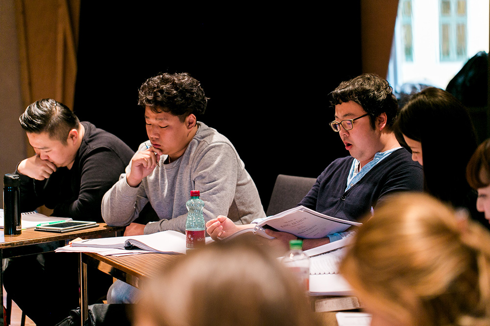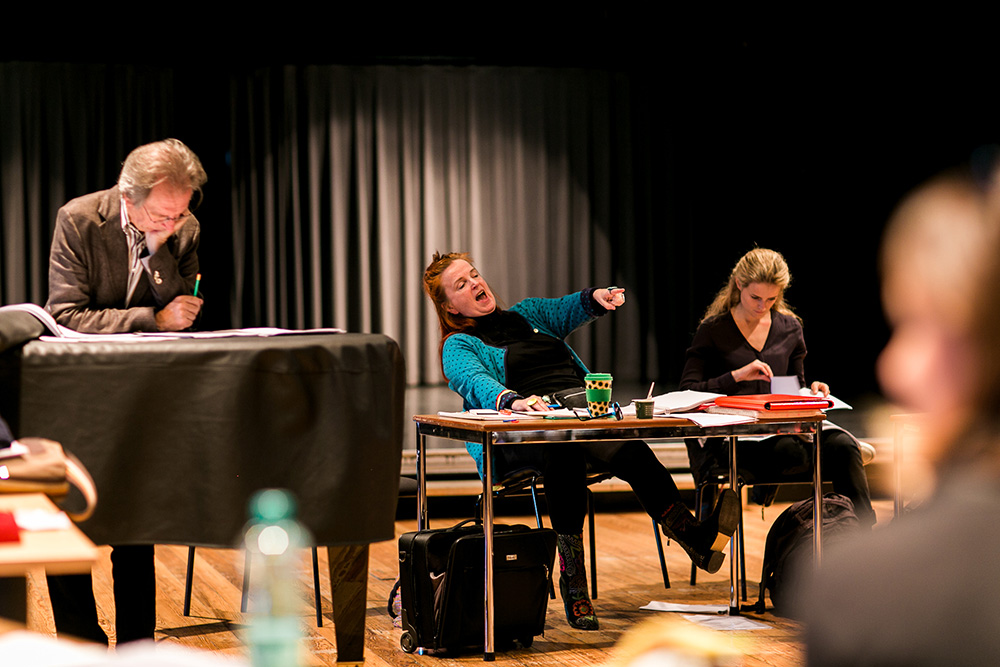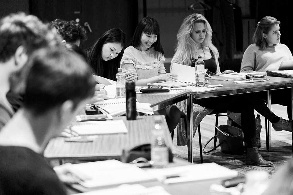 BB: Everyone does this differently; I begin rehearsing pretty early. In part for pragmatic reasons: I have a lot of students whose German isn’t that great—they come from Japan, Thailand, Korea, Taiwan, Finland, Iceland. Being such an international bunch, it doesn’t make much sense to spend forever talking. So we discuss things using our bodies. I’ve worked out a method that we use to communicate where I say: “Show me what you thinking of, a scene or an image.” And by the way: sitting around a table is something you do in spoken theatre. We start out by sitting around a piano!