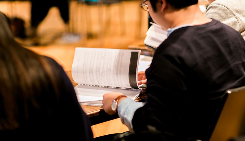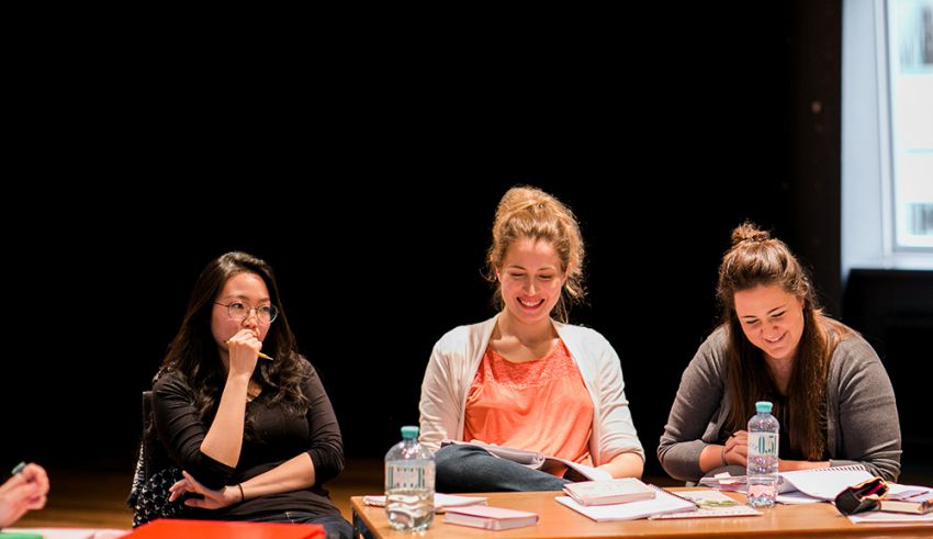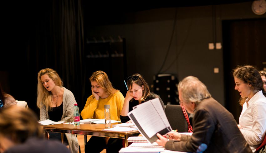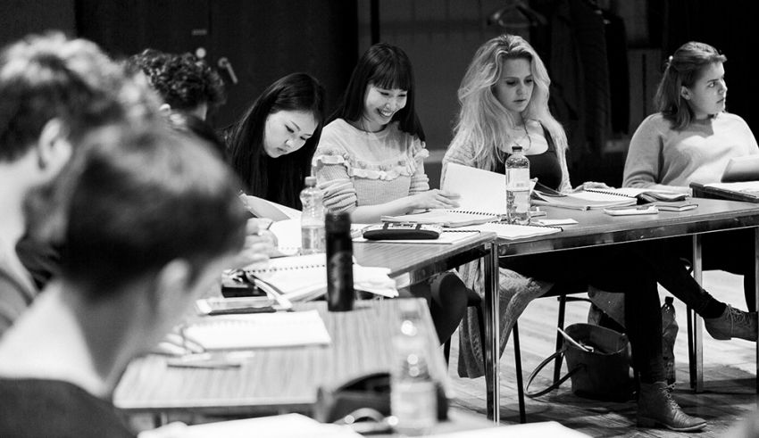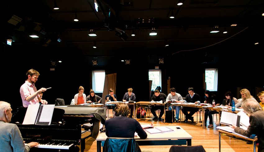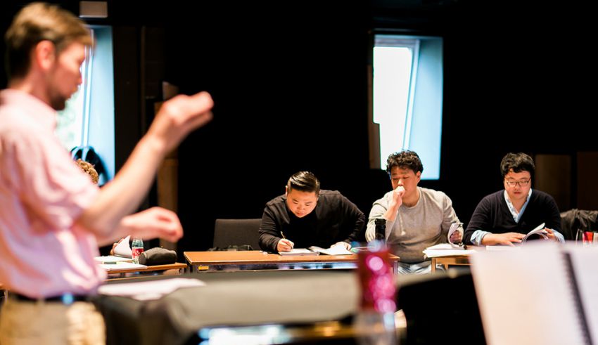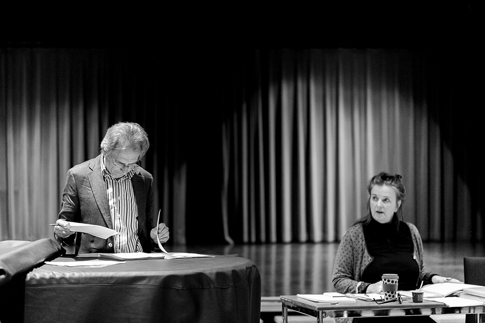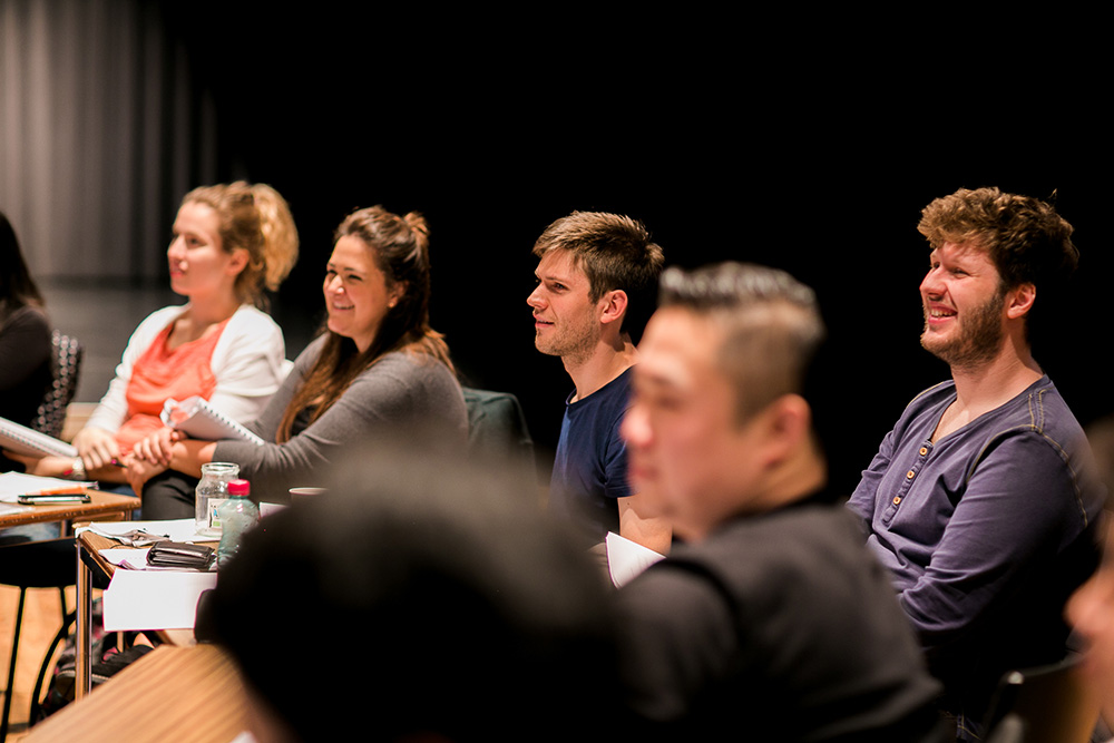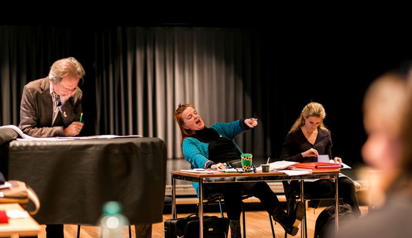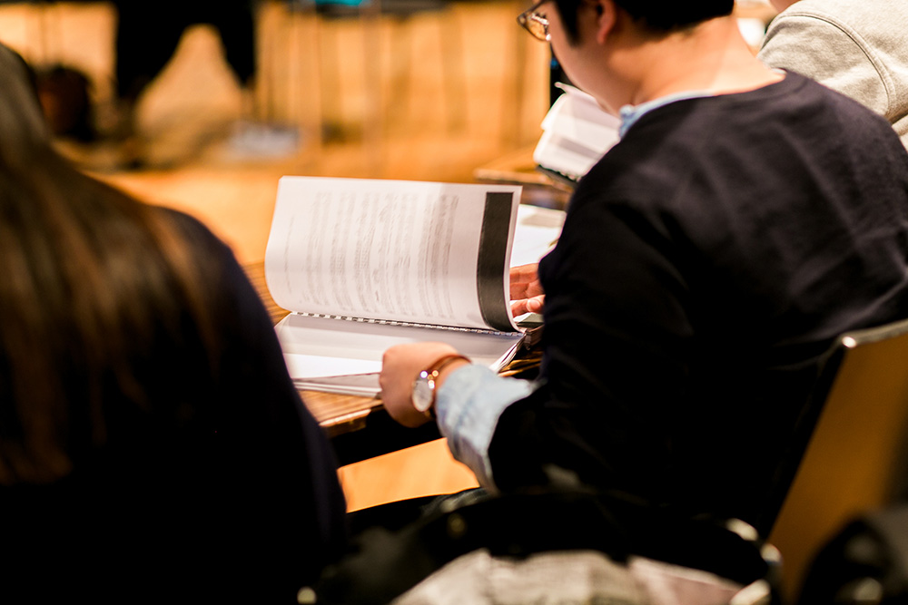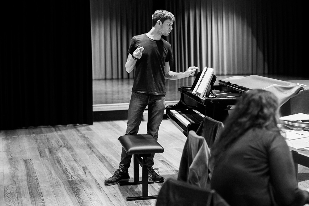 BB: Everyone does this differently; I begin rehearsing pretty early. In part for pragmatic reasons: I have a lot of students whose German isn’t that great—they come from Japan, Thailand, Korea, Taiwan, Finland, Iceland. Being such an international bunch, it doesn’t make much sense to spend forever talking. So we discuss things using our bodies. I’ve worked out a method that we use to communicate where I say: “Show me what you thinking of, a scene or an image.” And by the way: sitting around a table is something you do in spoken theatre. We start out by sitting around a piano!