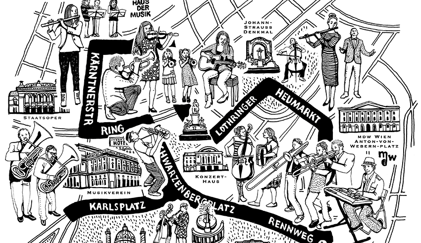 This project will feature “sound islands”—hot spots distributed around Vienna’s Inner City that will host activities by mdw departments along with further invited institutions and individuals from the educational and cultural fields. The ideas behind these sound islands are myriad: from public rehearsals by a cello class where passers-by will be invited to comment on what they’re hearing to walk-in speech training offered by students from the Max Reinhardt Seminar, and from a waltz ensemble in front of the Stadtpark’s Johann Strauss statue to opportunities to try out various musical instruments. “The only limits are those imposed by one’s imagination,” emphasises Wolfgang Aichinger. The central focus here is on the significance of conveying and receiving art, and the overall concept dissolves the classic frontal dichotomy of performer and audience. It also does without the usual venues like concert halls or theatres, where the audience sees and hears the performers from a designated seating area. The point is much rather to convey the things that are taught and practiced daily at the mdw—doing so in the spontaneous atmosphere of public space and involving people whose presence is, at least in part, coincidental. This also presents the opportunity to reach those individuals who usually don’t go to the theatre, the opera, or concerts. The roles of performers and audience are broken up, with nobody limited to playing just one role, for the ability of passers-by to participate in public lessons or to comment on what they’ve heard entails that they themselves convey something, with the performers becoming listeners.