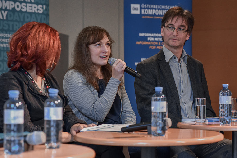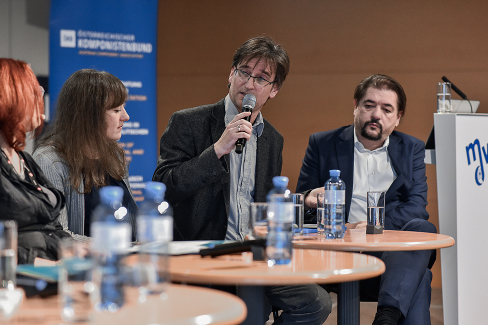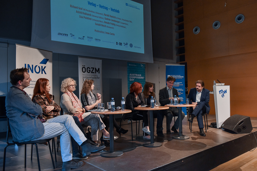 Im Fachtalk Verlag – Vertrag – Vertrieb diskutierten Richard Graf (NÖ Musikedition, Komponist), Harald Hanisch (A1 Music, Vizepräsident ÖKB), Astrid Koblanck (Universal Edition), Gudrun Liemberger (Songwriterin), Lisa Pointner (InTension Music), Renate Publig (Verlag Doblinger) und Gerald Resch (Komponist), wie sich Verlagsarbeit in Zusammenarbeit zwischen Musikschaffenden, Verlagen und dem Konzertbetrieb heute gestaltet. Moderiert wurde das Panel von Irene Suchy.