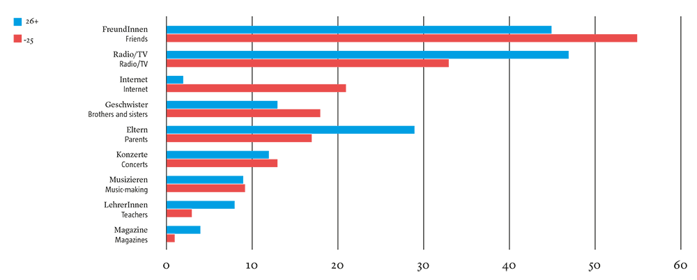 What can, however, be ascribed to digitalisation is the musical behaviour that differs most of all between today’s young people and older generations: the use of the Internet and smartphones. The most significant group segment variations in the entire study can be seen in how the generations that were socialised in the analogue and digital eras differ in the way they use the Internet for music (figure 1). While older people more often access music via the radio (followed by TV and CD), among young people the smartphone has progressed from last place to first place in the space of only five years (2010–2015). The immense significance of the Internet as a key differentiator between the generations can also be seen in the importance young people attach to it for their own musical socialisation; as can be seen in figure 2, this difference is disproportionately large.