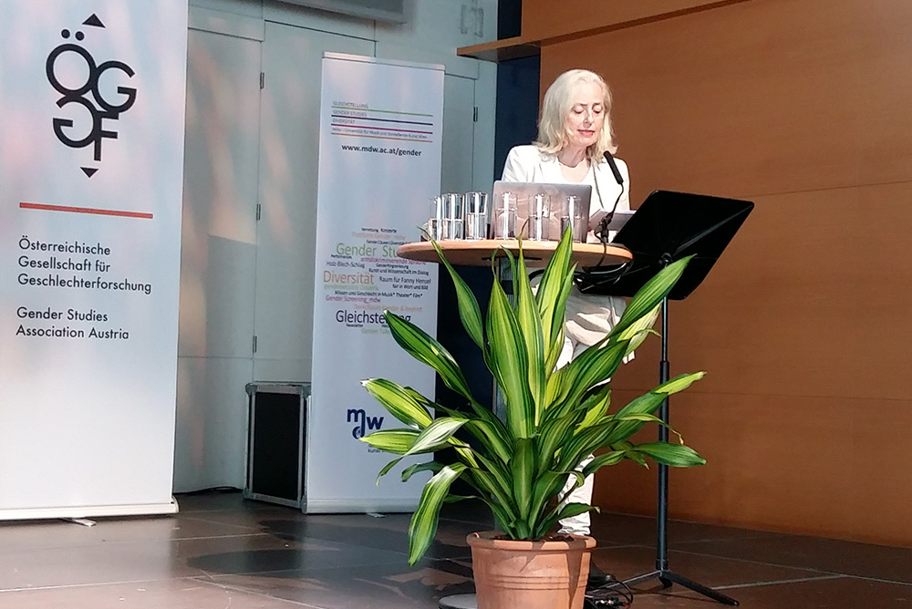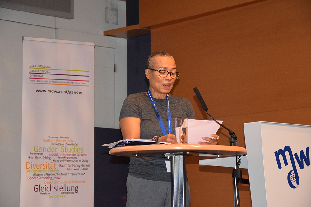 Die aussichtsreichen Eröffnungsworte durch Rektorin Ulrike Sych, Gerda Müller (Vizerektorin für Organisationsentwicklung, Gender und Diversity/mdw), Iris Rauskala (Sektionschefin für Wissenschaft und Forschung, Bundesministerium für Bildung, Wissenschaft und Forschung), Maria Mesner (Obfrau der ÖGGF), Andrea Ellmeier (Leiterin der Stabstelle Gleichstellung, Gender Studies und Diversität/mdw) und Doris Ingrisch (Professorin am Institut für Kulturmanagement und Gender Studies/mdw) fanden ihren Höhepunkt mit Katharina Klements künstlerischem Beitrag Vessel 1.3, wodurch das vielseitige Tagungsprogramm in seinem transdisziplinären Spektrum auch klanglich dargeboten wurde.