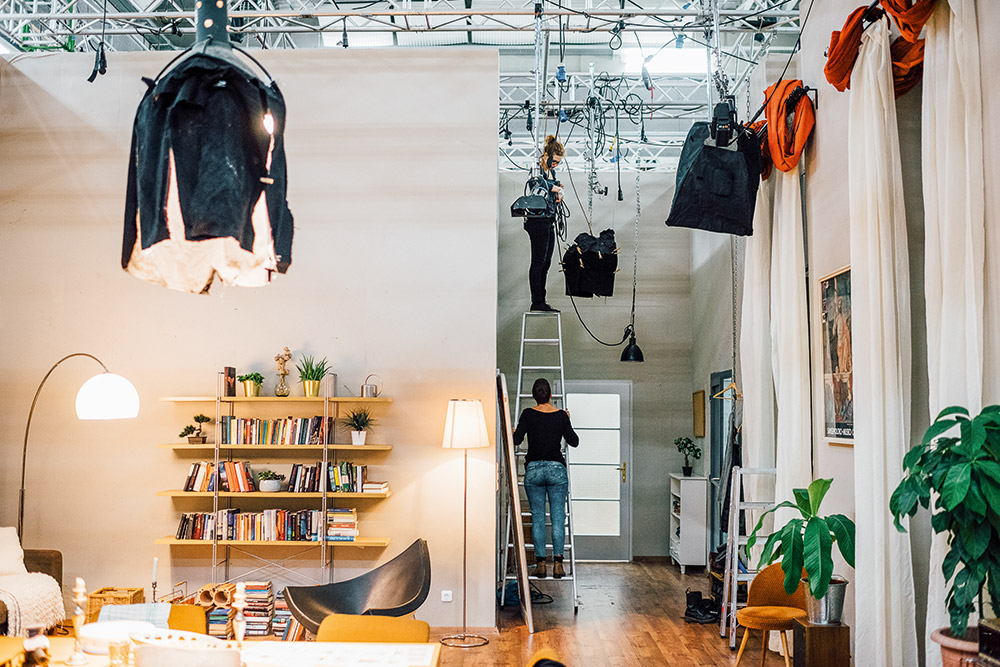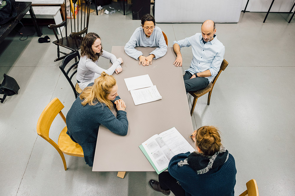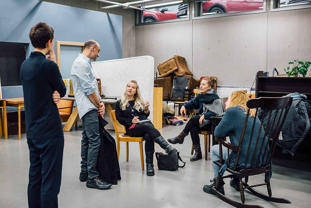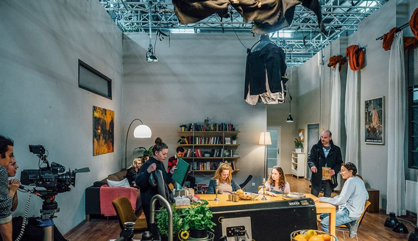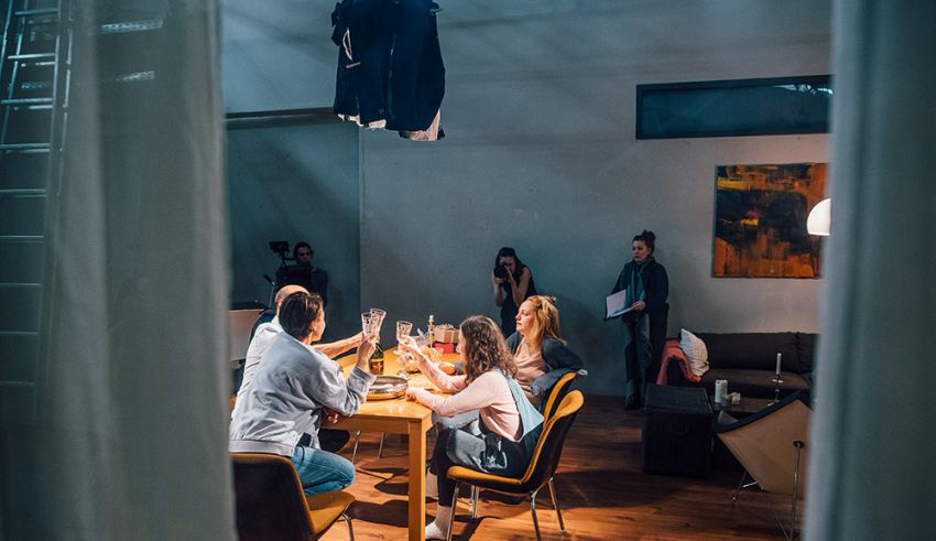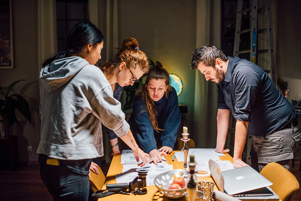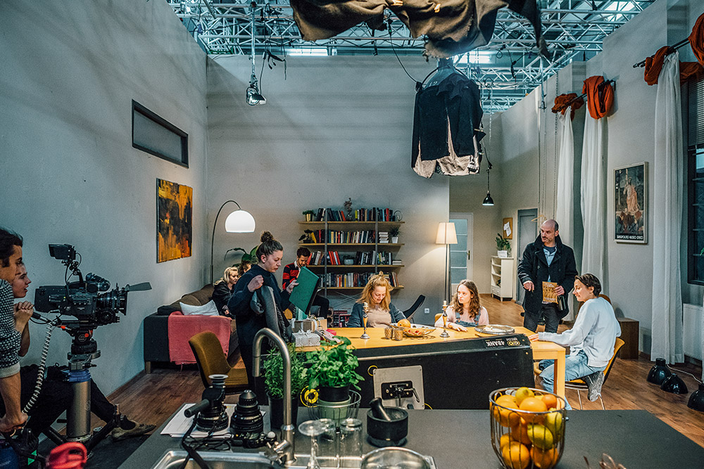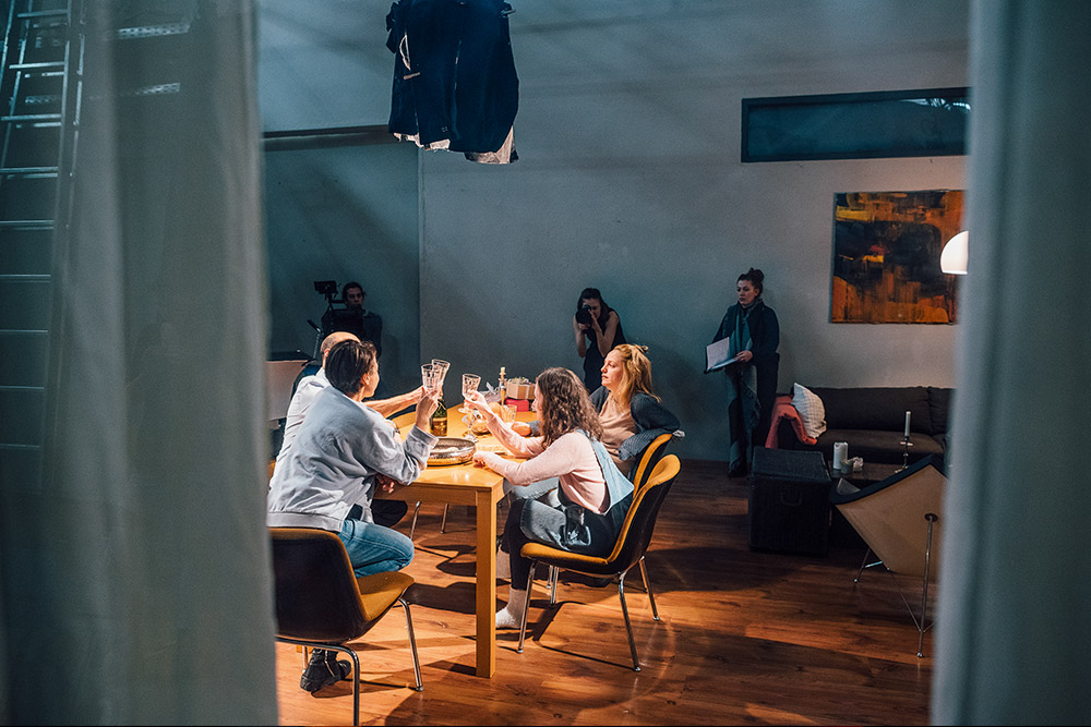 Wenn alles bereit ist, kommen die Schauspieler_innen gemeinsam mit der Regisseurin direkt in die Kulisse. Es werden Kameraeinstellungen probiert, die Szene einmal durchgespielt und noch einige Hinweise durch die Regisseurin gegeben. Alle Beteiligten sind bereit für den kommenden Drehtag.