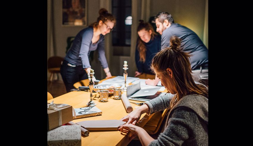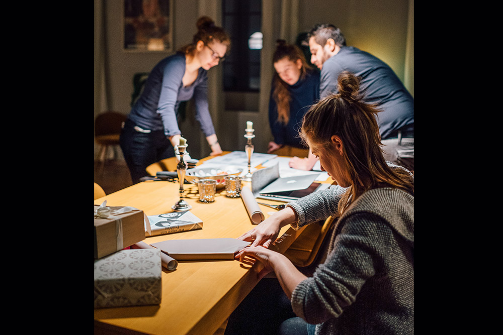 Die Kulisse steht – es gilt jedoch noch einige Feinheiten für Saskias Kurzfilm vorzubereiten. So werden noch Requisiten fertig gemacht – wie z. B. eine Torte lackiert oder Geschenke verpackt, die für den morgigen Dreh benötigt werden. Saskia bespricht in der Zwischenzeit mit ihrem Team noch einige Details zu einzelnen Kameraeinstellungen.