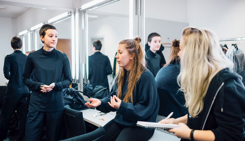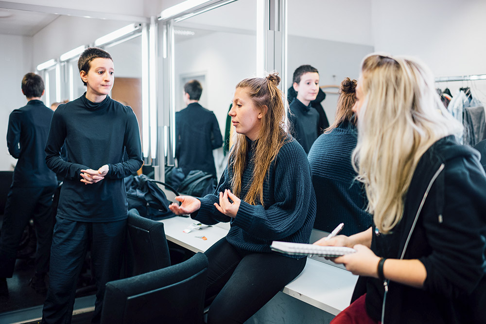 Während die Beleuchtung eingerichtet wird, Kameras herbeigeholt und eingestellt werden und viele andere letzte Vorbereitungen am Set getroffen werden, kommen die Schauspieler_innen an die Filmakademie.