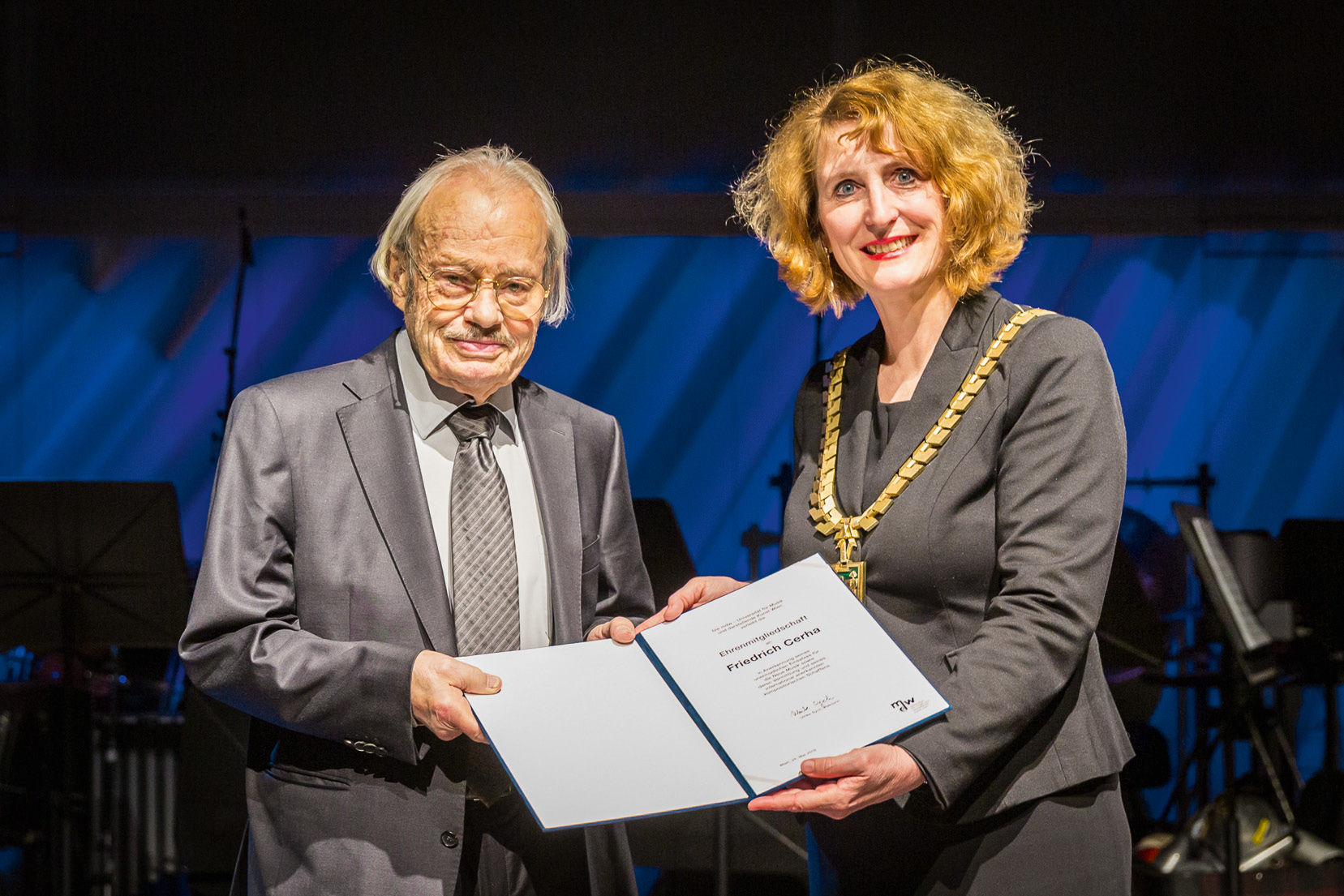 Der 1926 in Wien geborene Künstler Friedrich Cerha blickt auf eine langjährige Laufbahn als Komponist sowie ein herausragendes Engagement im Bereich der zeitgenössischen Musik zurück. Cerha begann 1959 seine Lehrtätigkeit an der damaligen Hochschule, 1976 wurde er zum Professor berufen und unterrichtete bis zu seiner Emeritierung 1988. In diesen Jahrzehnten hat er ganz wesentlich zur Profilbildung des Kompositionsbereiches an der mdw beigetragen und zahlreiche Komponist_innen ausgebildet, etwa Karlheinz Essl, Georg Friedrich Haas, Christian Ofenbauer, Ulf-Diether Soyka und Tomaž Svete. Rektorin Ulrike Sych im Rahmen der Verleihung: „Friedrich Cerha ist ein Vorbild als Künstler, als Lehrender und vor allem als Mensch mit einer Haltung, die zum Wohle unserer Demokratie unverhandelbar ist und sein muss.“