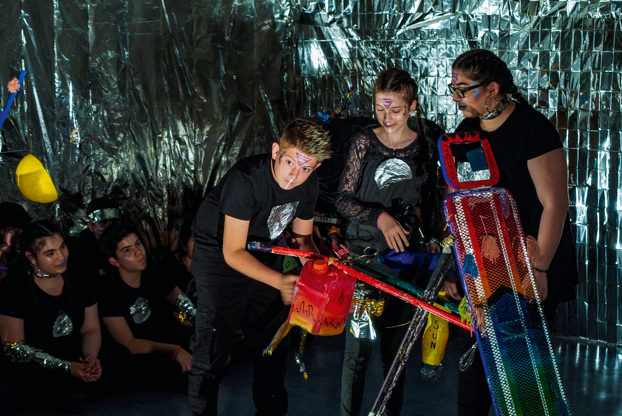 This project revolved around the development of an experimental music theatre work and took the word EINANDER (each other, one another) as its motto. A special feature of EINANDER as a theme is how, by adding prefixes like MIT- (with), FÜR- (for), and GEGEN- (against), one can arrive at meanings that can then be addressed in the involved artistic media of text, music, and visual imagery. While students made music on Baschet instruments during the first project year, the second year saw them design their own sound sculptures—which they then constructed out of everyday items and waste materials and subsequently painted.