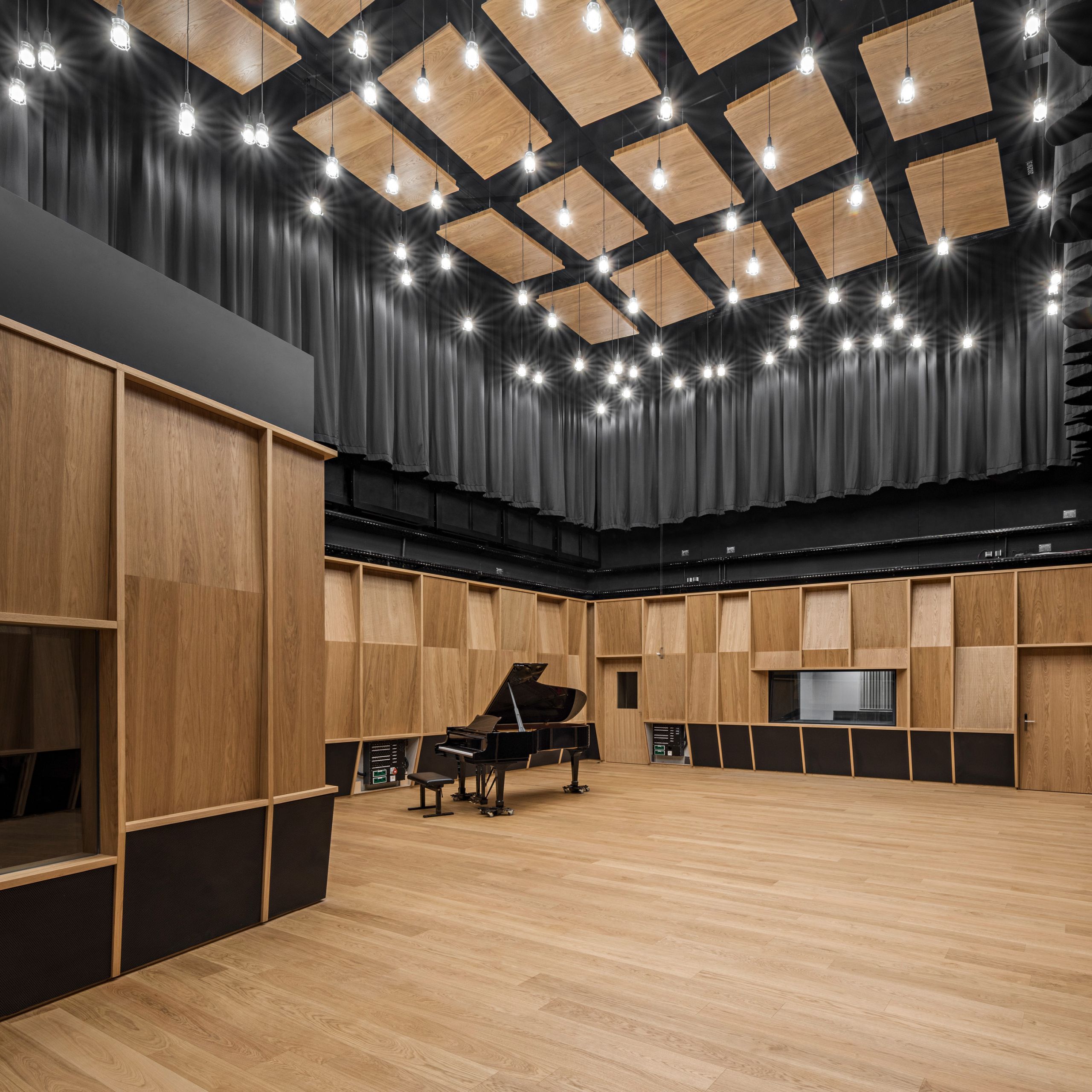 Das Resultat kann sich sehen lassen. So ist es möglich, von allen drei Regieräumen das Geschehen im Aufnahmesaal und dem größeren der beiden Iso-Booths durch große Studiofenster zu verfolgen. Darüber hinaus haben zwei Regieräume ein weiteres Sichtfenster in den direkt angrenzenden Veranstaltungssaal, das Klangtheater, um Konzerte mitzuschneiden.