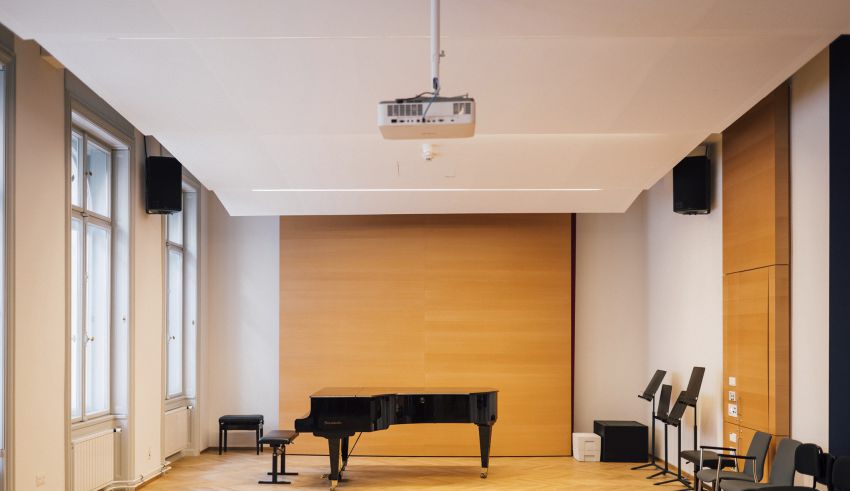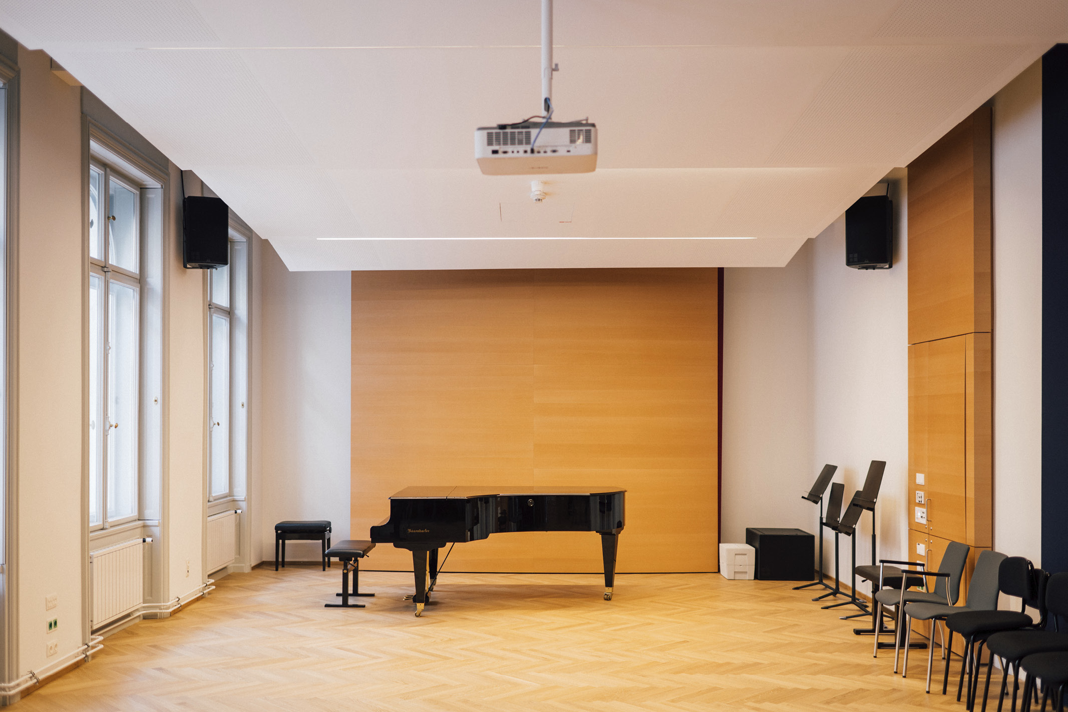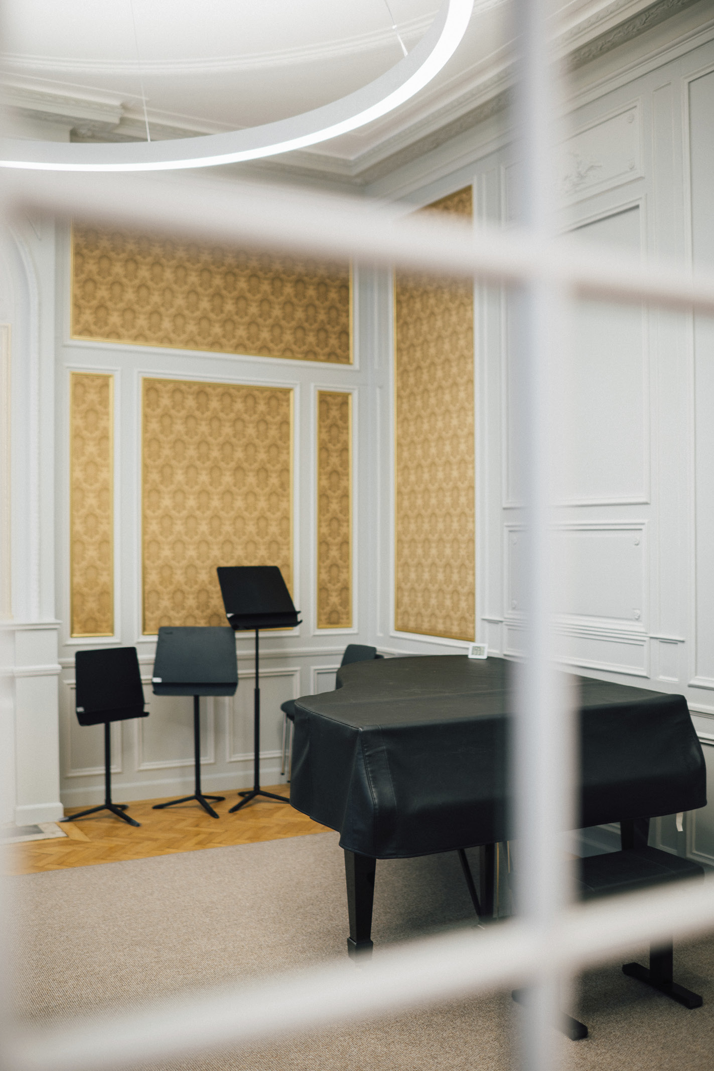 In den Innenräumen wurde besonders darauf geachtet, die historischen Gegebenheiten des Hauses zu bewahren und gleichzeitig für den Studienalltag zu modernisieren. Die alten Türen wurden erhalten und gleichzeitig durch weitere Zwischentüren erweitert, damit die Räume möglichst schalldicht sind. Im Konzertsaal wurden mit Stoff überzogene Wandpaneele eingezogen, die je nach Instrument auch verschoben werden können, um einen zusätzlichen Schallschutz zu bieten.
