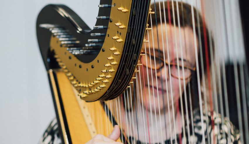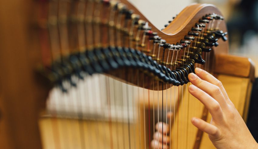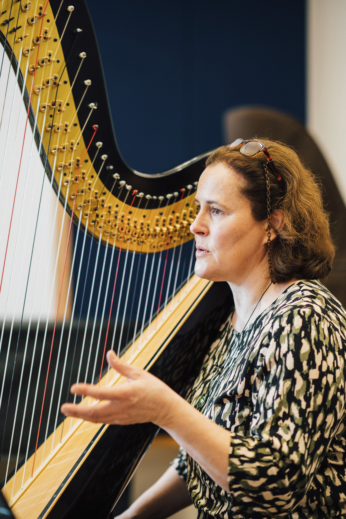 Im Rahmen des Unterrichts wird auch mit einer Kinderharfe geübt. Das deutlich kleinere Instrument kommt bei Lehreinheiten zum Einsatz, damit Julia auch mit diesem praktische Erfahrungen für zukünftige Lehreinheiten sammeln kann.
