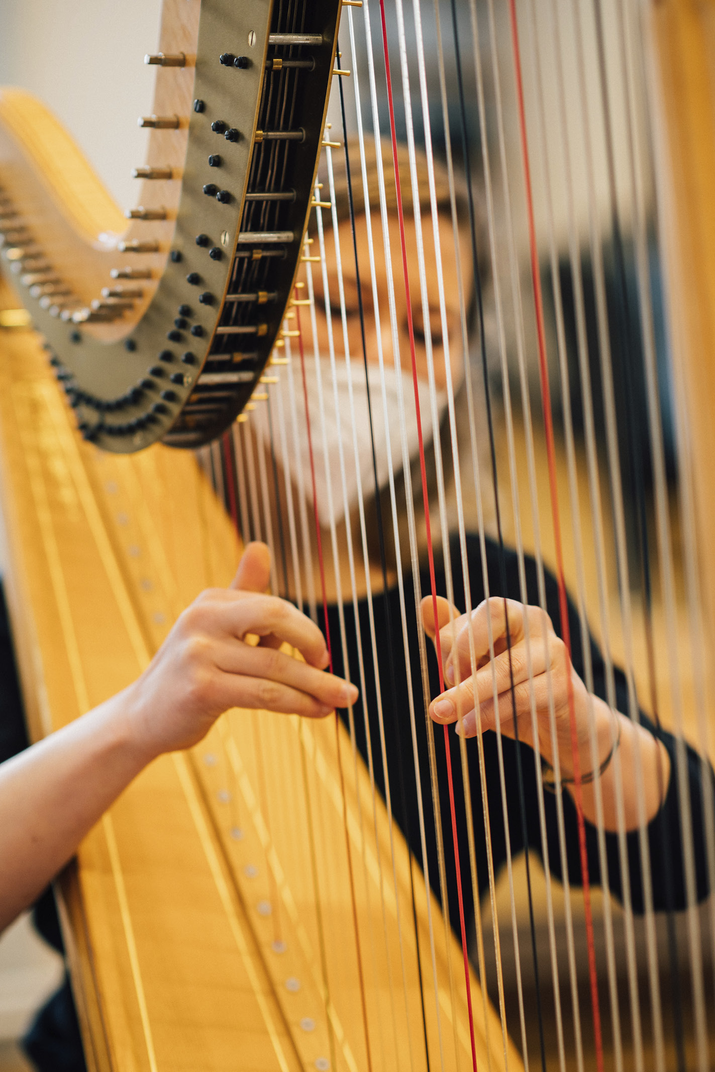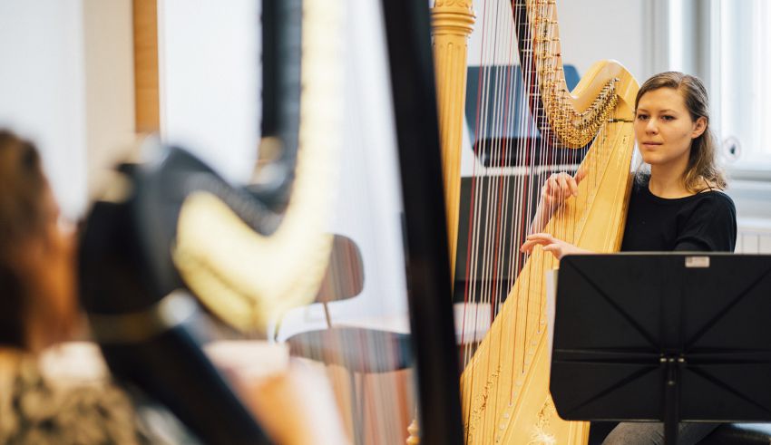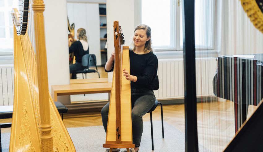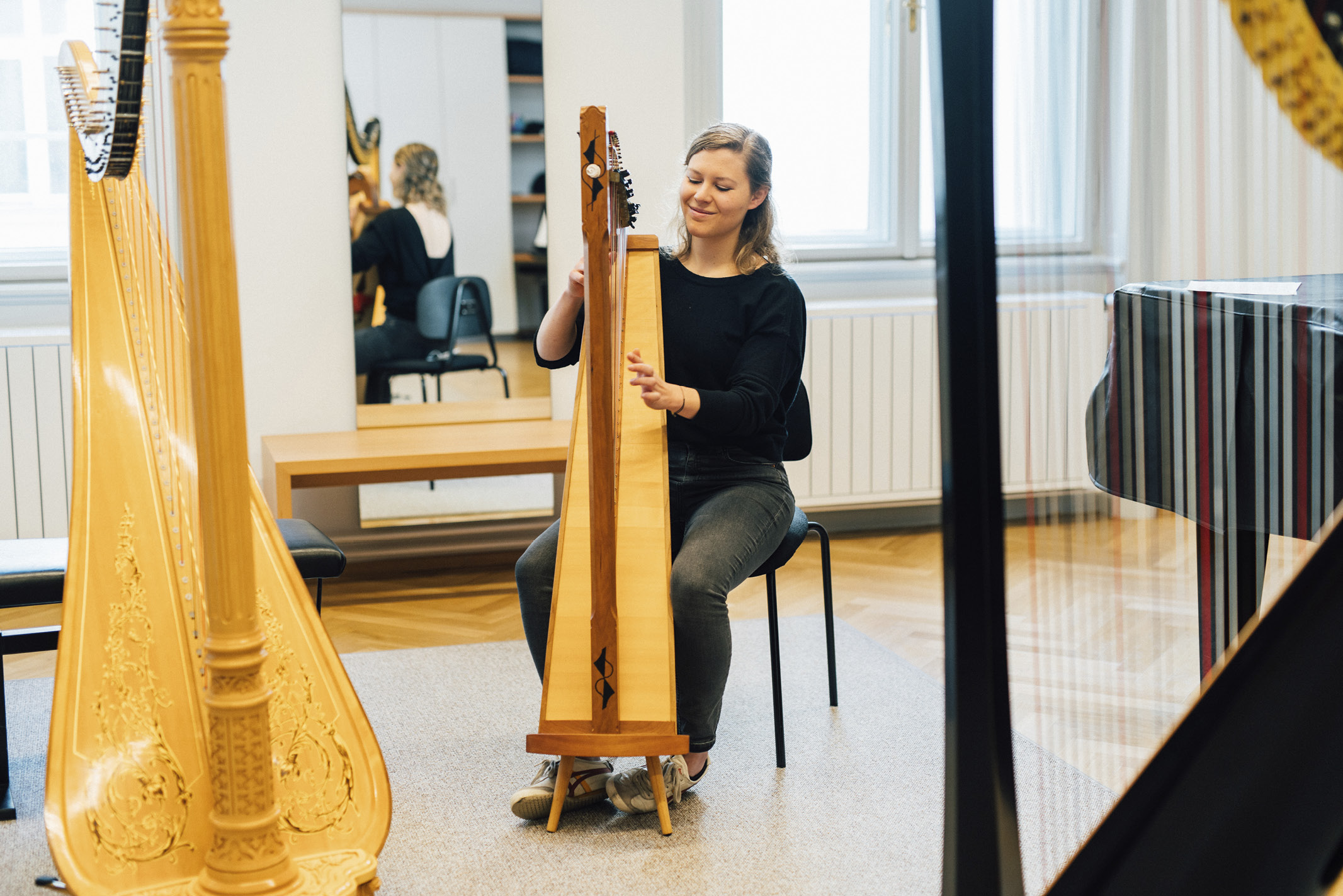 Für Julia Prömmer, die Harfe für Instrumental-(Gesangs-)Pädagogik bei Andrea Hampel studiert, beginnt der Tag mittlerweile auch in der Metternichgasse 12. Davor war sie hauptsächlich am alten Standort Rennweg, wo Räume oft geteilt werden mussten. „Ich freue mich so, hier zu sein, denn wir haben viel mehr Platz und man spürt einfach richtig die Geschichte des Gebäudes“, betont Julia, die bald ihr Studium abschließen wird. In der Früh nutzt sie oft die Zeit, um sich im Übungszimmer vorzubereiten. Danach folgt ein Vorspielen in der Klasse, das als Auftrittstraining dient. Jeder und jede muss etwas spielen und erhält dann Feedback. „Das ist sehr gut für die Praxis“, so Julia.
