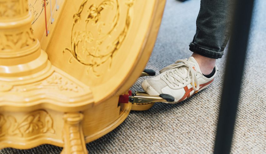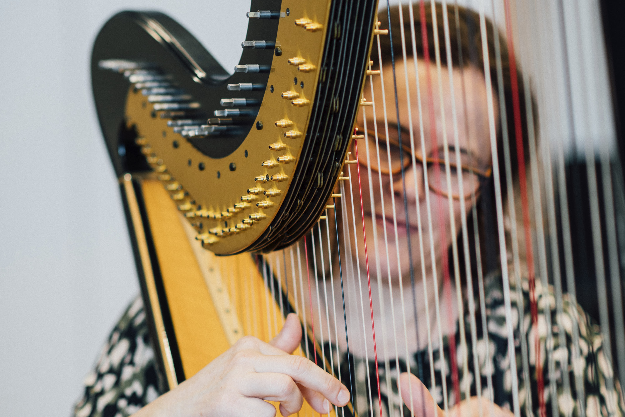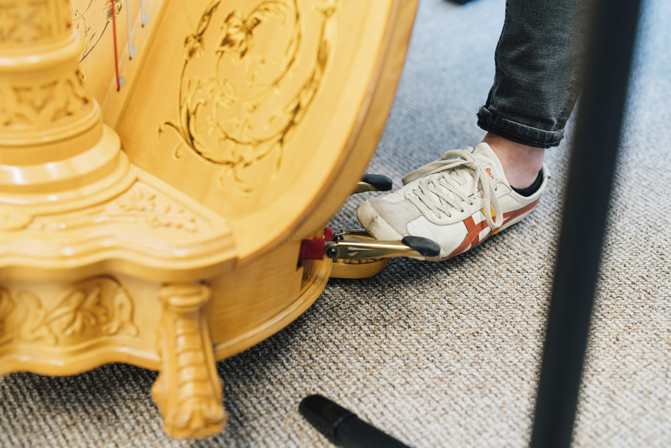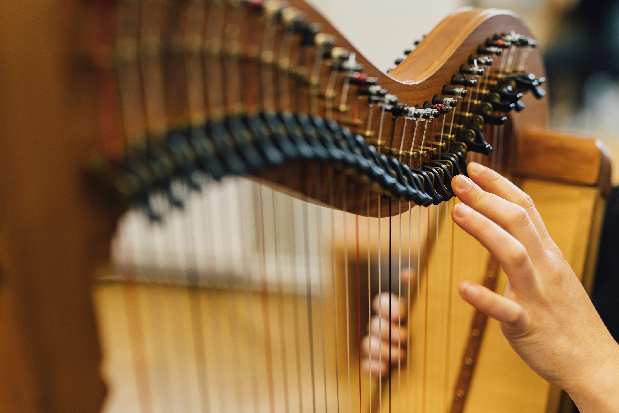 Für Julia Prömmer, die Harfe für Instrumental-(Gesangs-)Pädagogik bei Andrea Hampel studiert, beginnt der Tag mittlerweile auch in der Metternichgasse 12. Davor war sie hauptsächlich am alten Standort Rennweg, wo Räume oft geteilt werden mussten. „Ich freue mich so, hier zu sein, denn wir haben viel mehr Platz und man spürt einfach richtig die Geschichte des Gebäudes“, betont Julia, die bald ihr Studium abschließen wird. In der Früh nutzt sie oft die Zeit, um sich im Übungszimmer vorzubereiten. Danach folgt ein Vorspielen in der Klasse, das als Auftrittstraining dient. Jeder und jede muss etwas spielen und erhält dann Feedback. „Das ist sehr gut für die Praxis“, so Julia.
