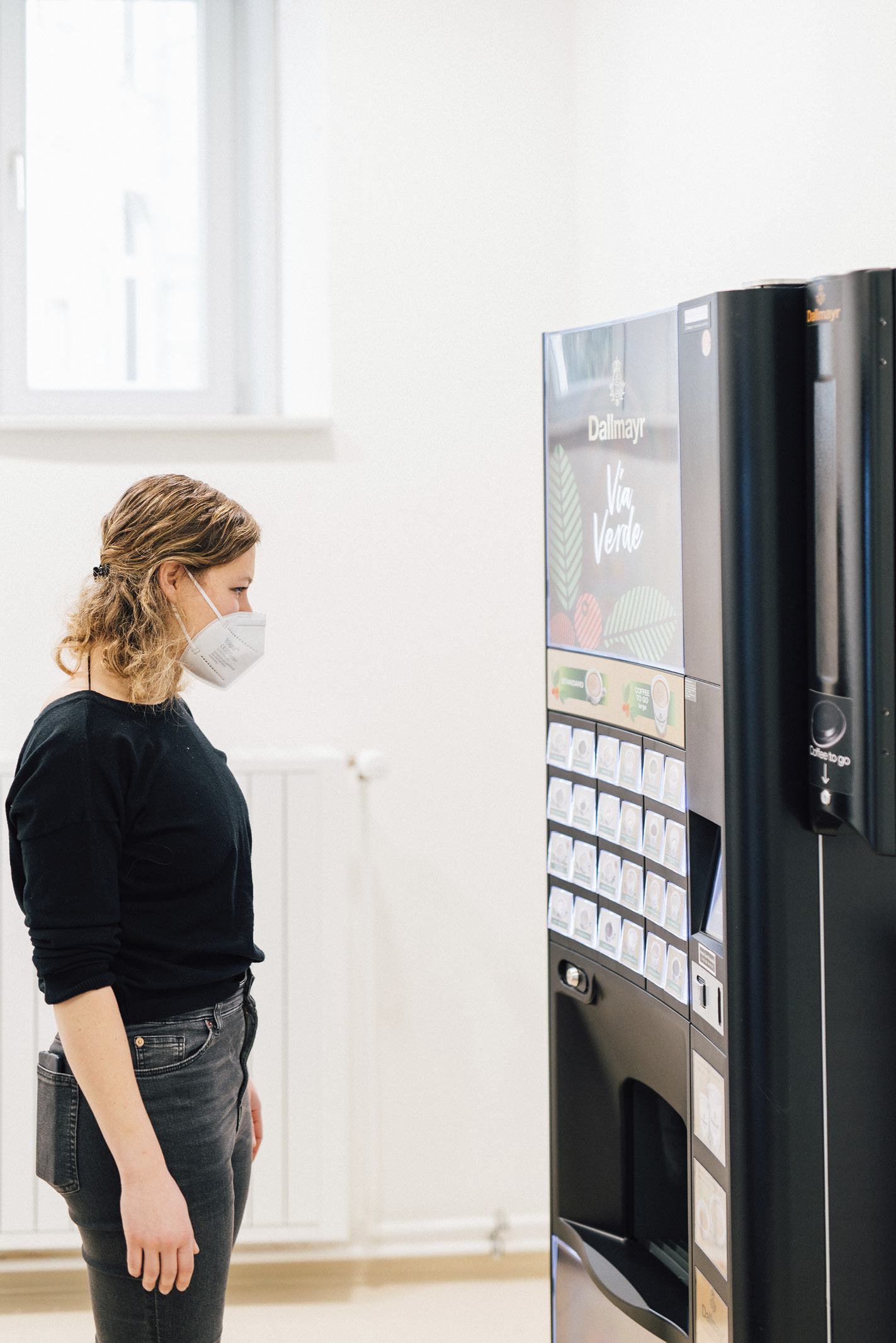 Nach dem Unterricht gönnt sich Julia eine kurze Pause. Das neue Institutsgebäude hat gleich im Erdgeschoß einen Snack- sowie Kaffee-Automaten. Aber auch in den oberen Stockwerken wurden Sitzgelegenheiten eingerichtet, um ausreichend Platz zum Lernen und Erholen zu haben.