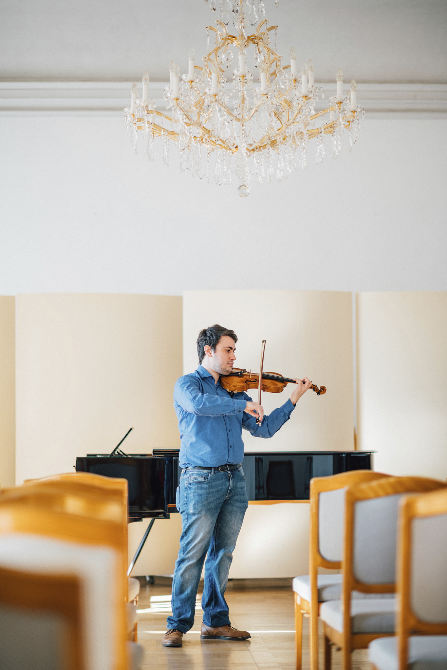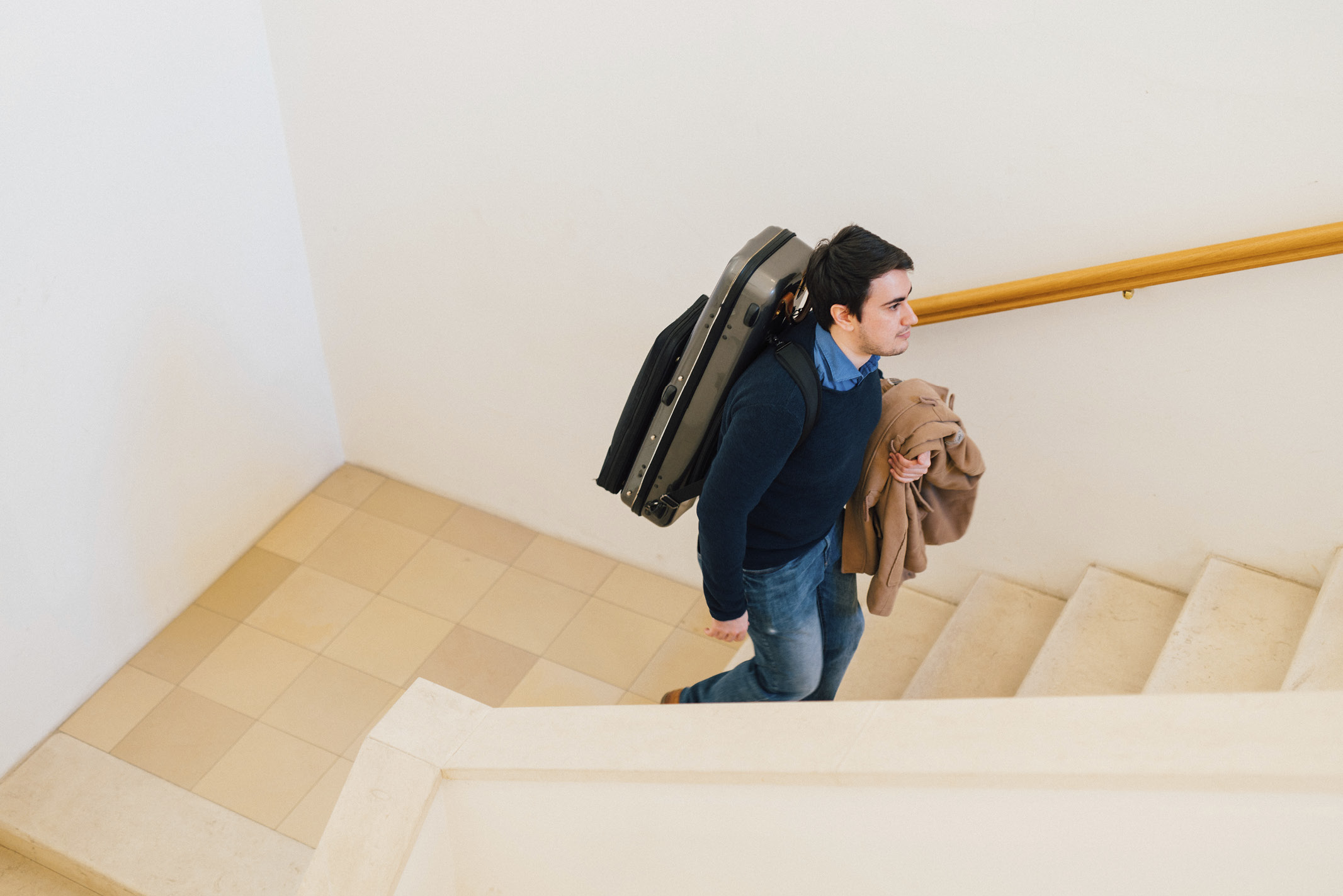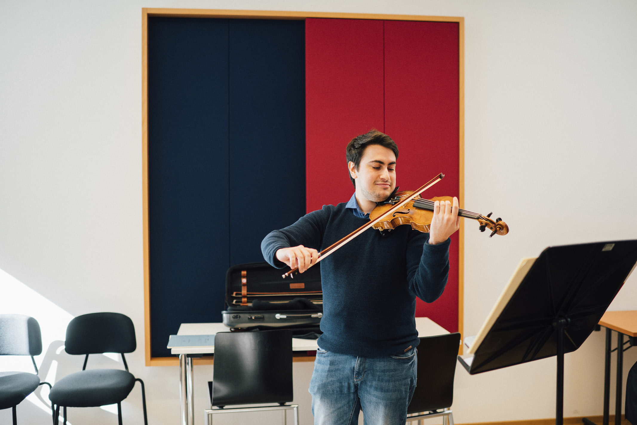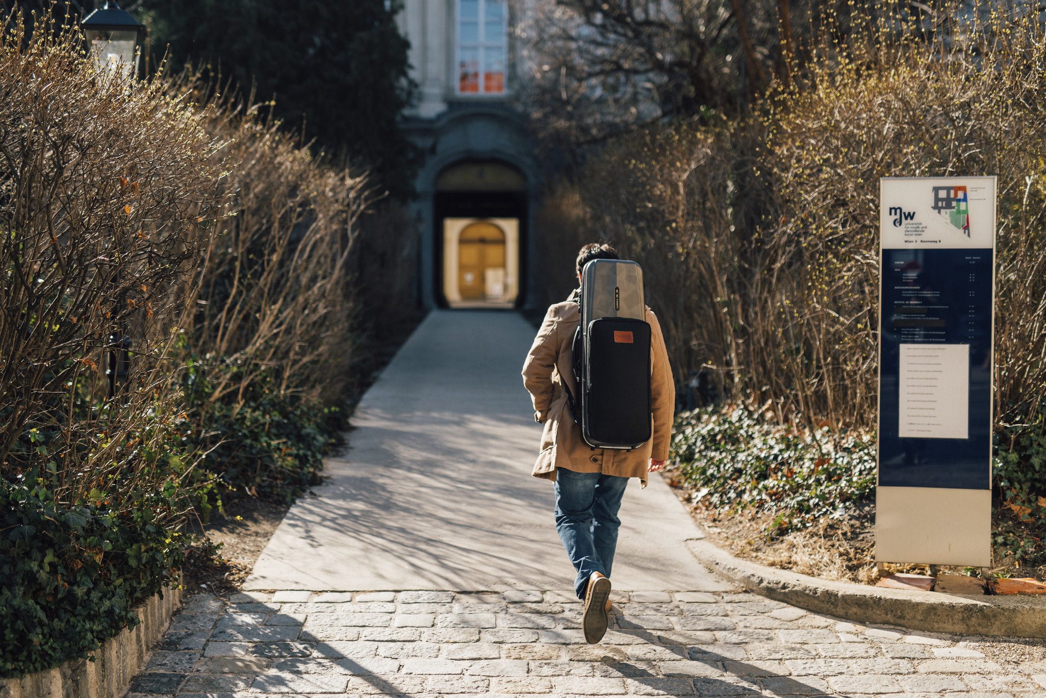 Im Alten Konzertsaal angekommen, packt Federico gleich seine Violine aus und nutzt die Gelegenheit zum Spielen. Denn in wenigen Tagen wird er hier sein Abschlusskonzert geben. „Die Atmosphäre ist gleich ganz anders, wenn man in so einem historischen Raum spielt.“ Da der Saal selbstverständlich auch ausreichend Platz für Publikum bietet, hofft er, dass dieses Mal, anders als noch bei seiner Prüfung im Jänner, auch Freund_innen und Familie zuhören können. Nach dem Üben nutzt der gebürtige Italiener die Sitzgelegenheiten im Innenhof für eine Pause und studiert noch einmal Notenblätter für die kommende Unterrichtsstunde. Dann geht es zurück in die Metternichgasse 12.