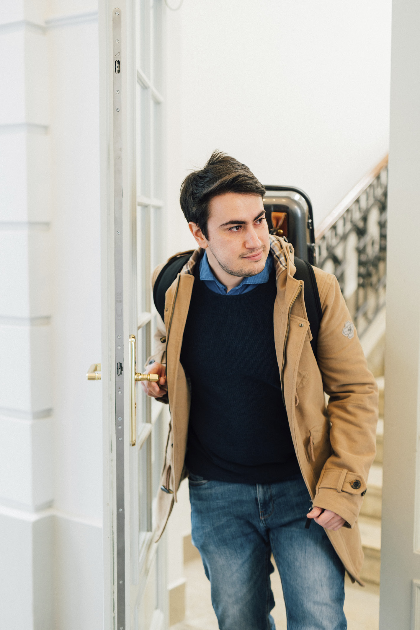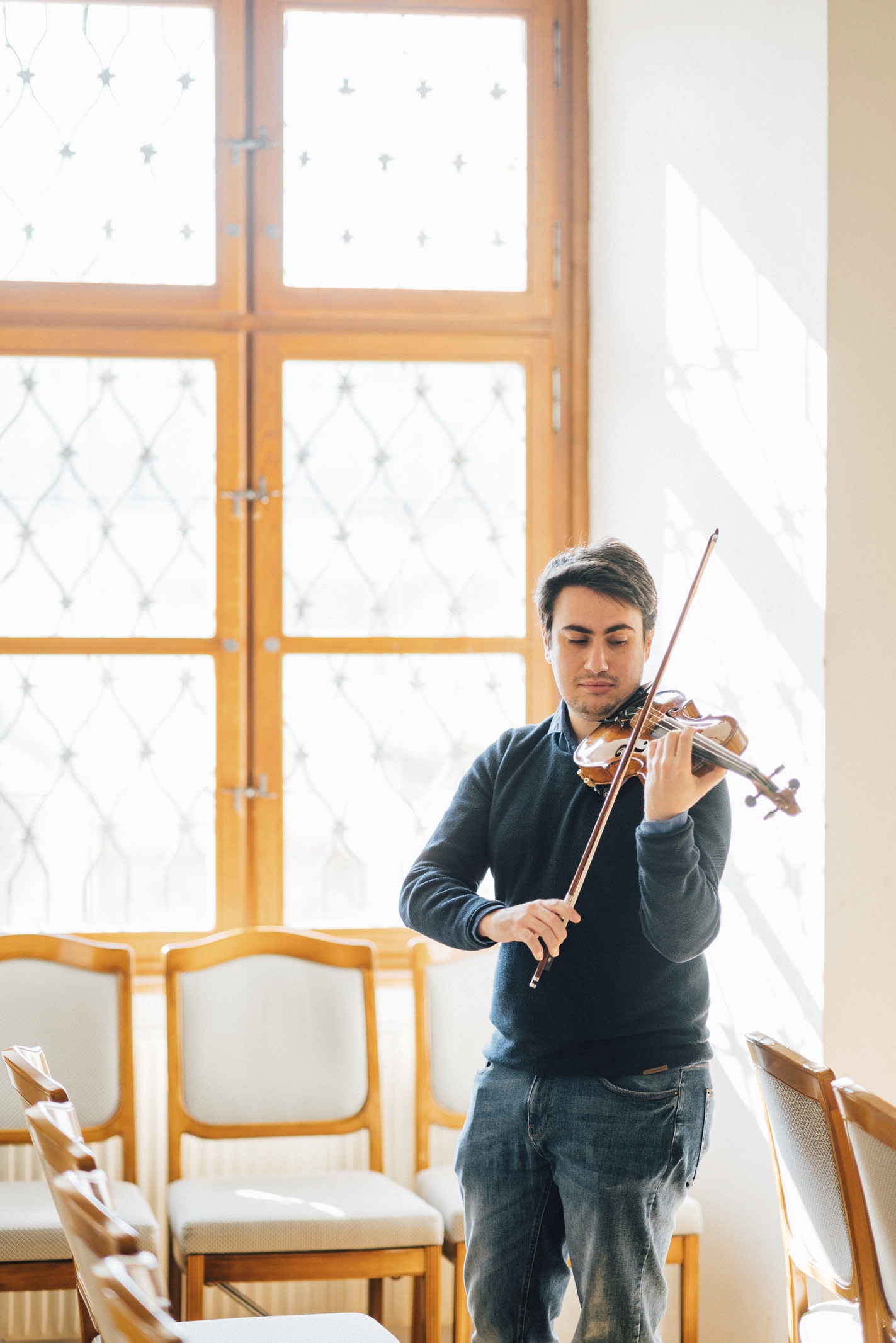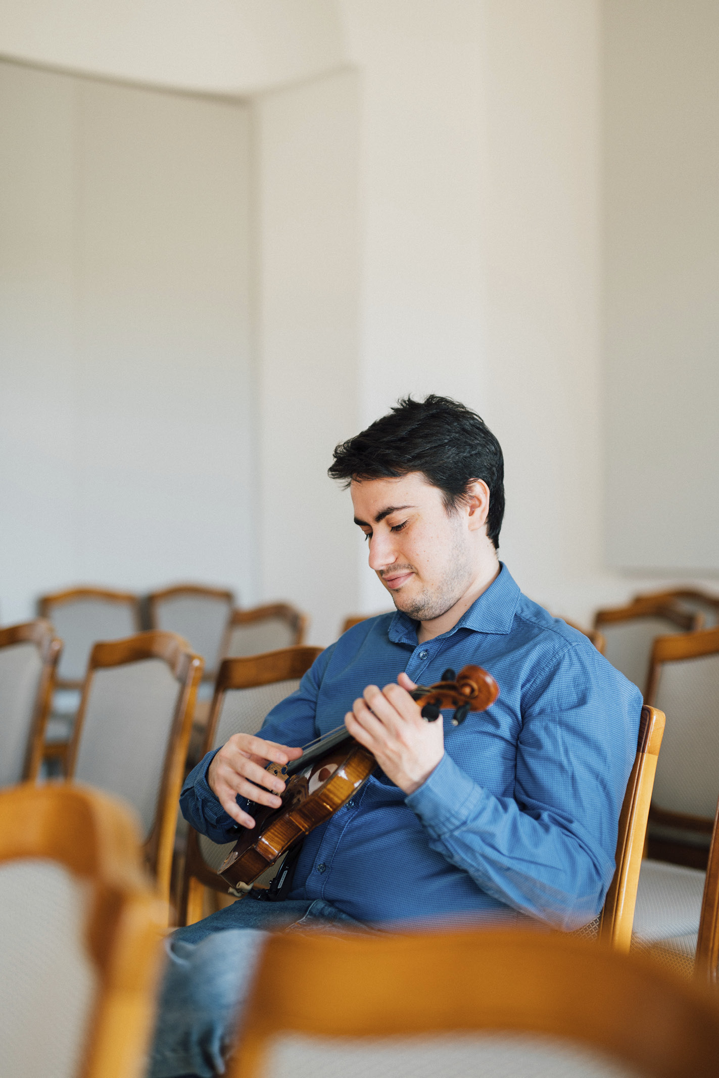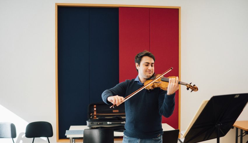 Im Alten Konzertsaal angekommen, packt Federico gleich seine Violine aus und nutzt die Gelegenheit zum Spielen. Denn in wenigen Tagen wird er hier sein Abschlusskonzert geben. „Die Atmosphäre ist gleich ganz anders, wenn man in so einem historischen Raum spielt.“ Da der Saal selbstverständlich auch ausreichend Platz für Publikum bietet, hofft er, dass dieses Mal, anders als noch bei seiner Prüfung im Jänner, auch Freund_innen und Familie zuhören können. Nach dem Üben nutzt der gebürtige Italiener die Sitzgelegenheiten im Innenhof für eine Pause und studiert noch einmal Notenblätter für die kommende Unterrichtsstunde. Dann geht es zurück in die Metternichgasse 12.