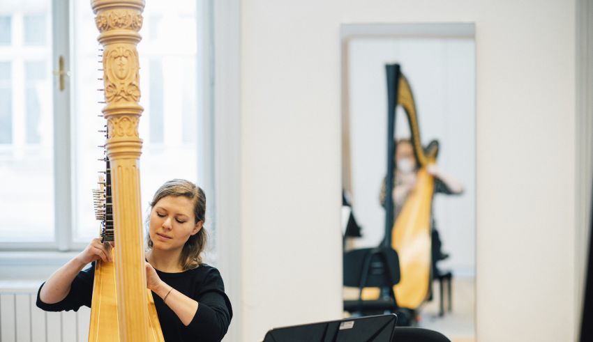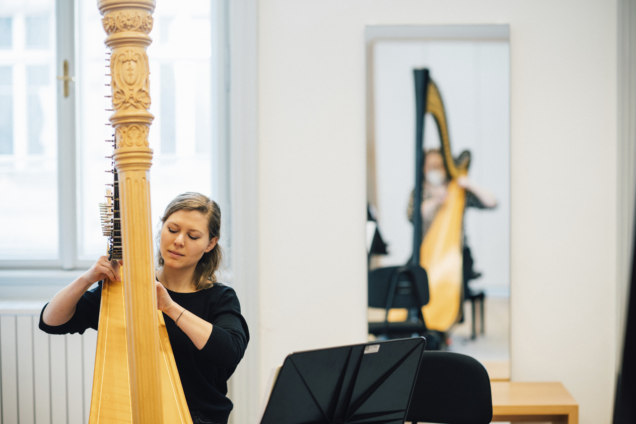 Julia Prömmer, who studies harp with Andrea Hampel in the Music Education for Voice and Instruments programme, is among those who now begin their day at Metternichgasse 12. She’d previously been at the old location on Rennweg, where rooms often had to be shared. “I’m so happy to be here, because we have lots more space and you really do just feel the history of the building,” emphasises Julia, who will soon be graduating. She often uses the morning hours to prepare in a practice room. That’s followed by playing in front of her class, which functions as performance training. Everyone has to play something, and they’re also given feedback. “It’s a great way to gather practical experience,” says Julia.