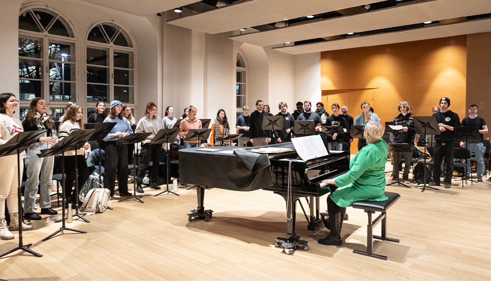 Dienstag, 18.30 Uhr. Im Clara Schumann-Saal der mdw finden sich Studierende verschiedener Studienrichtungen ein, empfangen von Miriam Steinkühler-Fuchsberger, Lehrende am ipop – Institut für Popularmusik. Ihr Auftrag heute, wie an anderen Dienstagen davor: In den vom Unitag müden Studierenden die Leidenschaft für das gemeinsame Singen entfachen. Das mdw-Magazin war bei einer dieser Chorproben dabei.