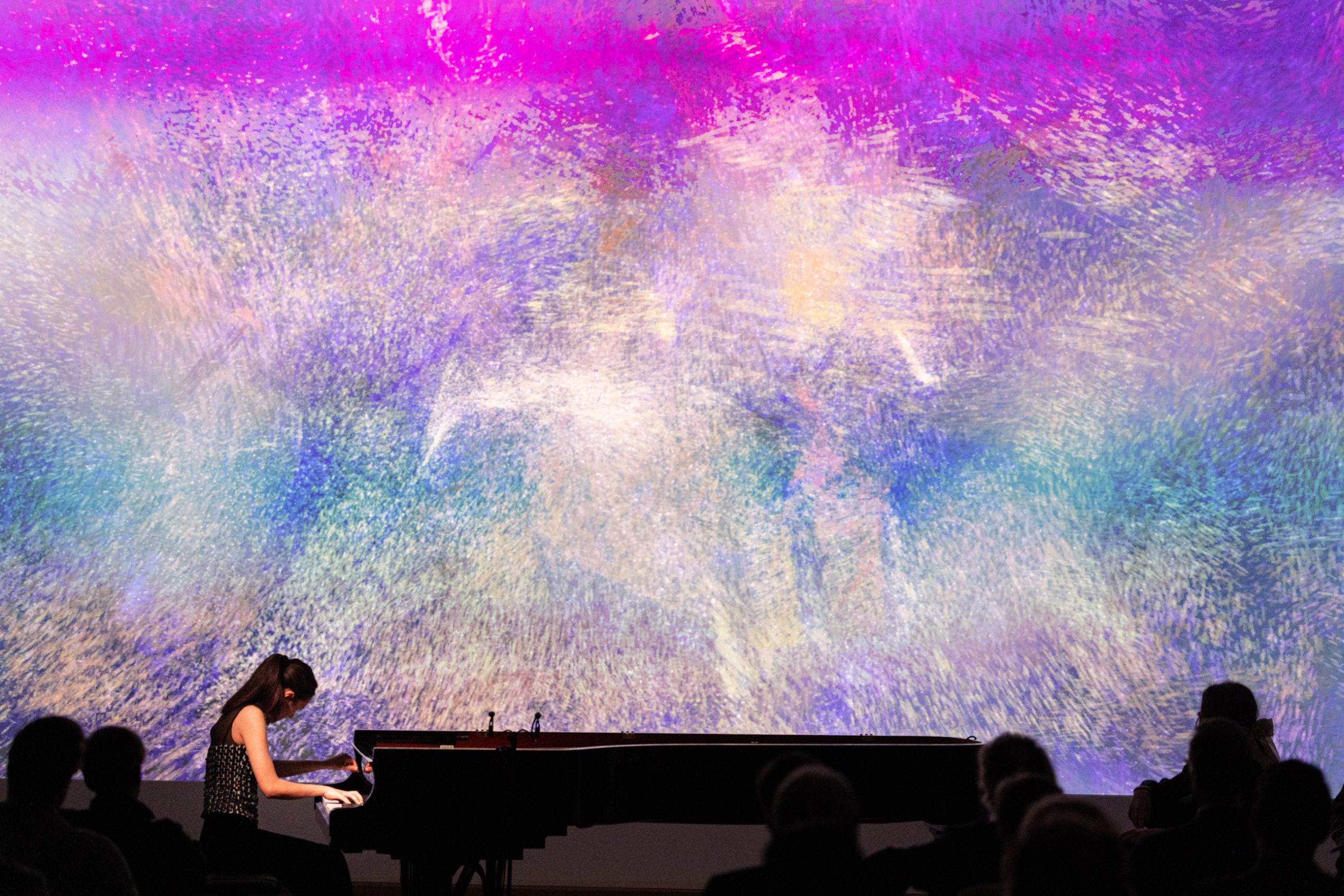Die Vorstellung, Musik mit anderen Kunstrichtungen zu verbinden oder sogar ineinander zu übersetzen, inspirierte immer wieder zahlreiche Komponist_innen. Für den Abend wurden daher Kompositionen mit synästhetischen Ideen von Claude Debussy, Alexander Skrjabin, Tristan Murail und Olivier Messiaen gewählt. Der Konzertflügel war an eine Software angeschlossen, die auf die Stücke, gespielt von mdw-Studierenden, in Echtzeit reagierte.