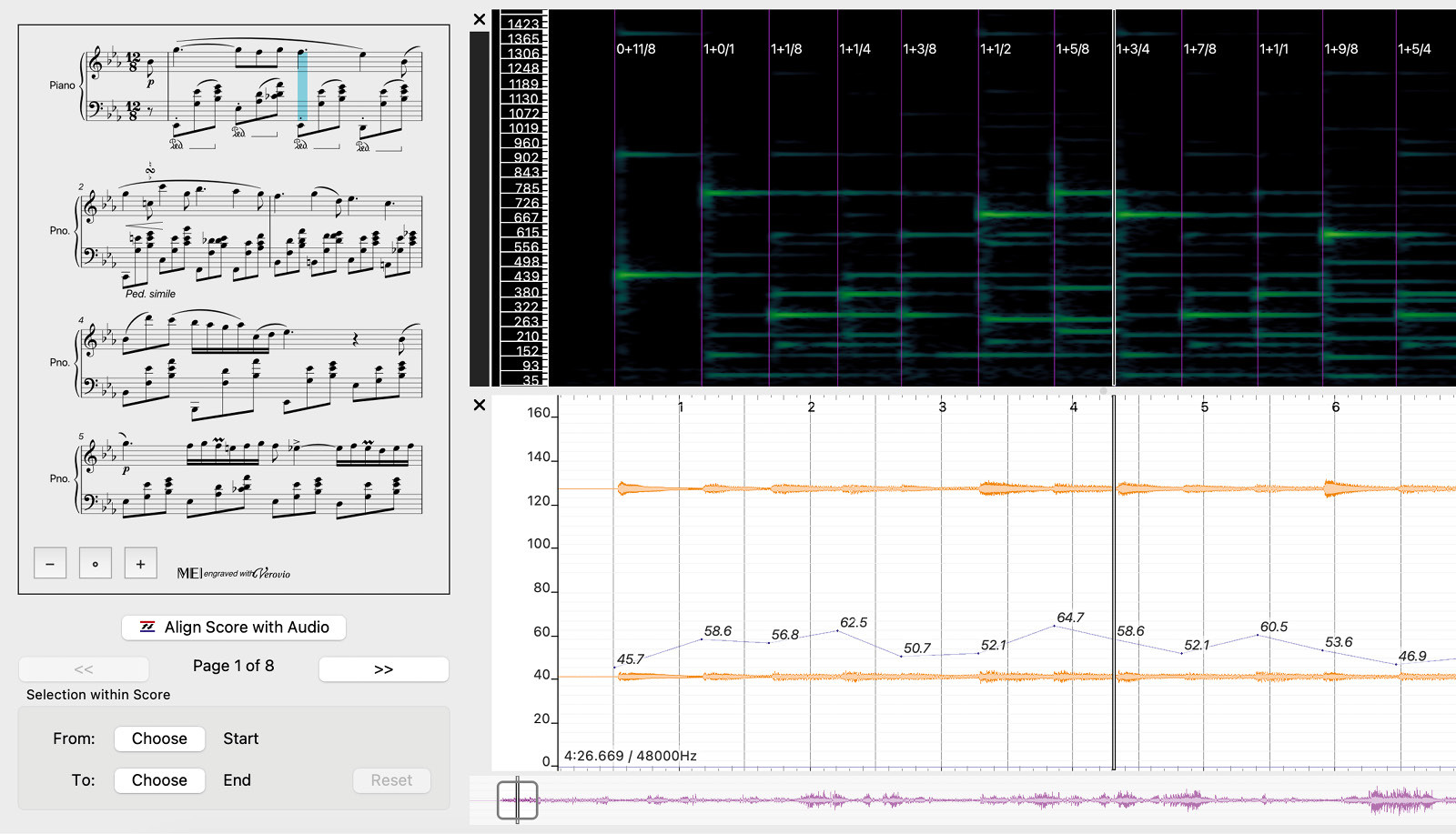 Natürlich ist kein KI-Algorithmus perfekt; daher ermöglicht die Software den Nutzer_innen, falsch erkannte Anfangszeiten, die mit der tatsächlichen Aufführung nicht übereinstimmen, zu korrigieren, indem sie diese in der Benutzeroberfläche einfach per Drag and Drop verschieben. Dabei werden die hervorgehobenen Noten in der Partitur gemeinsam mit beschrifteten Anfangszeiten in der Aufnahme angezeigt. Anschließend können Nutzer_innen die so validierten Annotationen und Tempoanmerkungen in eine Excel-Datei exportieren, um sie weiter zu analysieren. Diese Annotationen sind für die Forschungsarbeit äußerst wertvoll, da das Timing ein wesentlicher Aspekt musikalischer Ausdruckskraft ist.