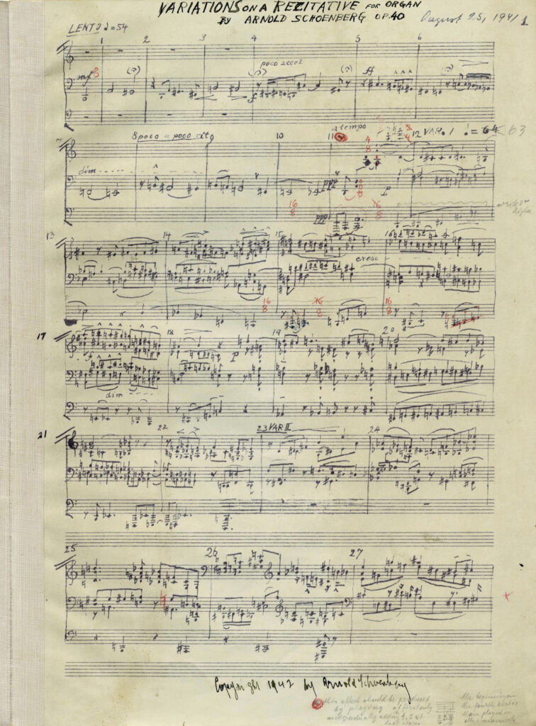 Markus Grassl (MG): Anlass unseres Gesprächs ist eine von dir in der Universal Edition vorgelegte neue kritische Ausgabe von Arnold Schönbergs einzigem vollendeten Orgelwerk, den Variations on a Recitative op. 40. Vielleicht rufen wir zunächst das Wesentlichste über das Stück selbst in Erinnerung.