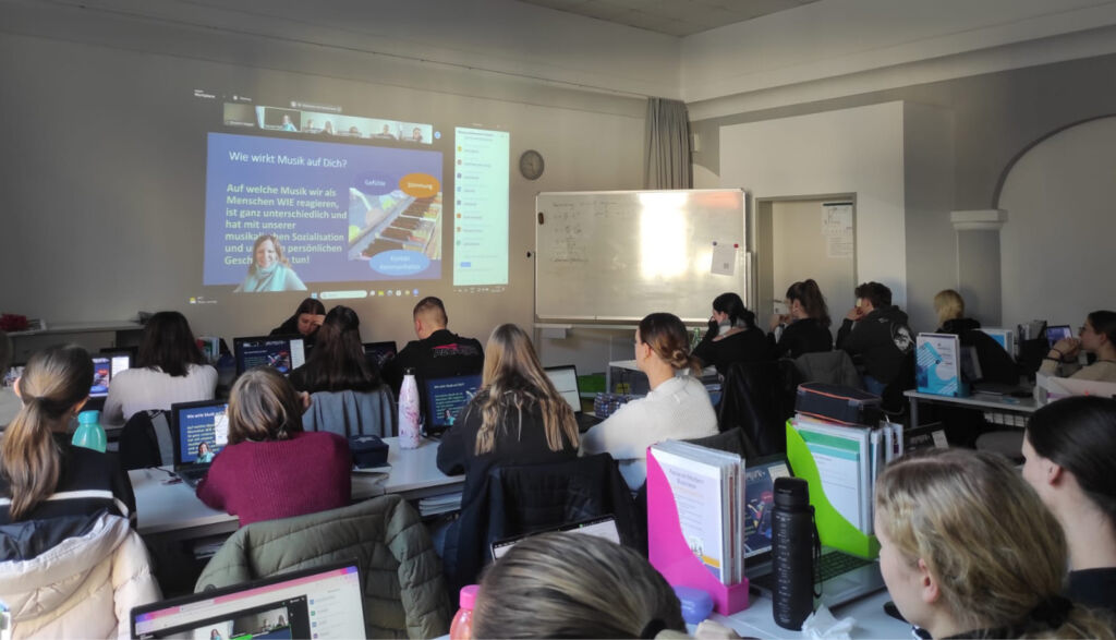 Hannah Riedl (HR): I usually start by asking school students what they think of when they hear the term “music therapy”, and it was once the case that a student asked me whether music therapy was for blind people. So picking up on however students might respond, I then go on to tell them about the areas where music therapy is used and how it all plays out. Older students often have an easier time associating things with various forms of therapy based on experiences of their own or of people they know. And with those students, discussions also tend to include questions about music therapy as a profession, what positions there are, and how the pay is.