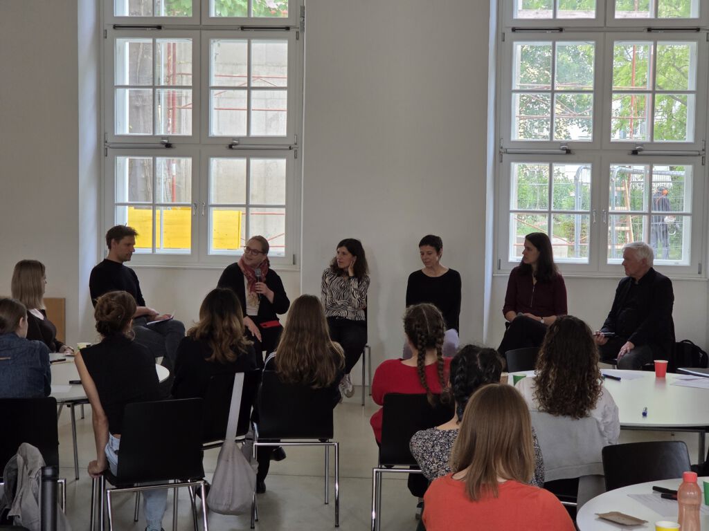 Mit dem Ziel, den Diskurs im Dialog mit den instrumental-/vokalspezifischen Didaktiken weiterzuführen, kamen anschließend Lehrende aus unterschiedlichen instrumentalpädagogischen Arbeits- und Berufsfeldern in einer Podiumsdiskussion miteinander ins Gespräch. Neben den beiden Herausgeber_innen nahmen Elisabeth Aigner-Monarth (Ludwig van Beethoven Institut für Klavier in der Musikpädagogik), Anna Guggenberger (Franz Schubert Institut für Blas- und Schlaginstrumente in der Musikpädagogik), Michael Göllner (Institut für musikpädagogische Forschung und Praxis) und Isabel Schneider (Alma Rosé Institut für Streichinstrumente, Gitarre und Harfe in der Musikpädagogik) teil.