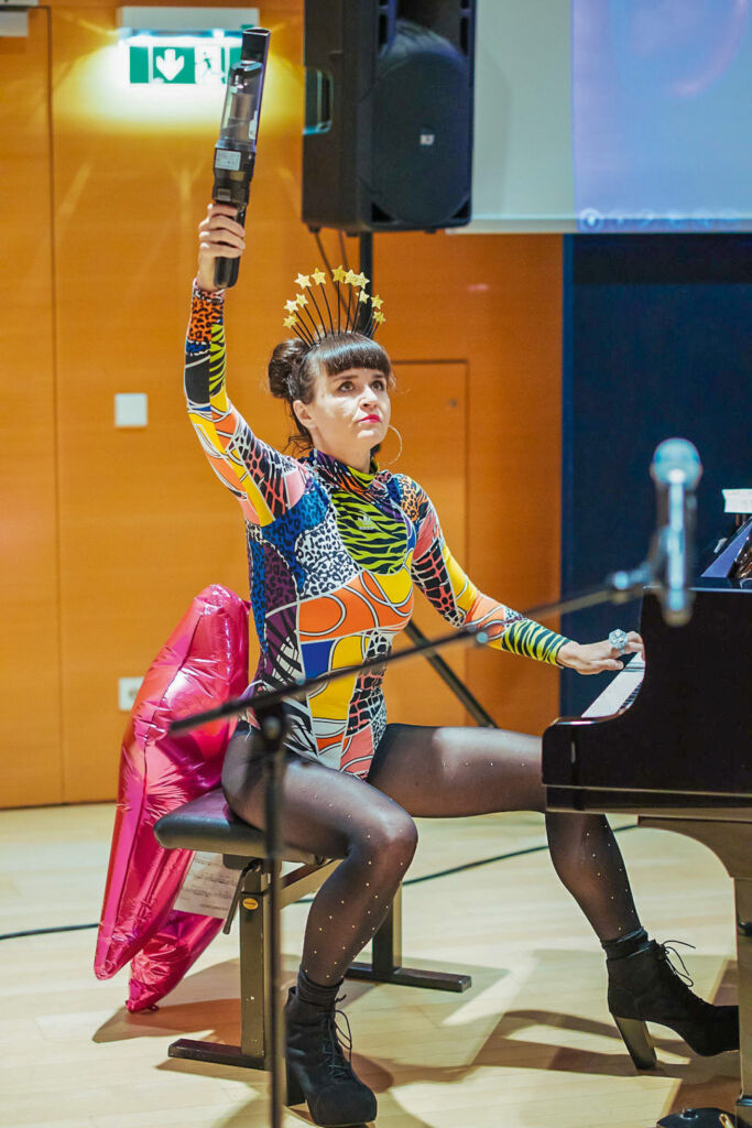 Da seit 2024/25 die vorwissenschaftliche Arbeit nicht mehr verpflichtend ist und auch künstlerisch-gestalterische Projekte eingereicht werden können, gingen heuer weniger Arbeiten ein und neun von 26 waren künstlerisch geprägt. 21 Gutachter_innen der mdw unterstützten uns mit ihrer fachlichen Expertise, eine Jury wählte aus 12 empfohlenen Arbeiten die Preisträger_innen aus. Neu war hierbei, dass alle Einreichenden direktes Feedback erhielten. Die Jury vergab insgesamt zehn Auszeichnungen: sechs Awards, drei „honorable mentions“ sowie einen Special Award. Inhaltlich reichten die Arbeiten von Auftrittsängsten bei Musiker_innen über John Cages 4’33, Konstantin Stanislawskis Schauspieltheorie und Kurt Schwitters Ursonate bis zur Bildsprache von Science-Fiction-Filmen oder zum Einfluss der Mafia auf die Musikindustrie am Beispiel Frank Sinatras. Weitere Themen waren Musik für Demenzpatient_innen, Magersucht im Schauspielberuf sowie Strategien, Theater für ein junges Publikum attraktiver zu machen. Das Institut für Kompositionsstudien zeichnete zudem Felix Widmosers Komposition Andante con Variazioni, Opus 1 mit einem Special Award aus. Die Verleihung fand am 25. September mit Vizerektorin Barbara Strack-Hanisch statt. Alle Preisträger_innen stellten ihre Arbeiten und Beweggründe persönlich vor. Durch den Abend führten Eveline Christof (Institut für musikpädagogische Forschung und Praxis) und Therese Kaufmann (Forschungsförderung) als Initiator_innen des Preises, mit musikalischen Beiträgen von Filip Anic am Klavier (Johannes Brahms: Intermezzo in A-Dur, Op. 118 Nr. 2, Andante teneramente), Magdalena Hahnkamper und Daniel Aebi (Performance DadaRella und der Angriff der Synkope!) sowie Leona Sperrer und Lea Carlotta Walenta (Nancy & Frank Sinatra: Something Stupid und die Eigenkomposition Arrow). Den Special Award überreichte Annegret Huber, Leiterin des Instituts für Kompositionsstudien, Ton- und Musikproduktion.