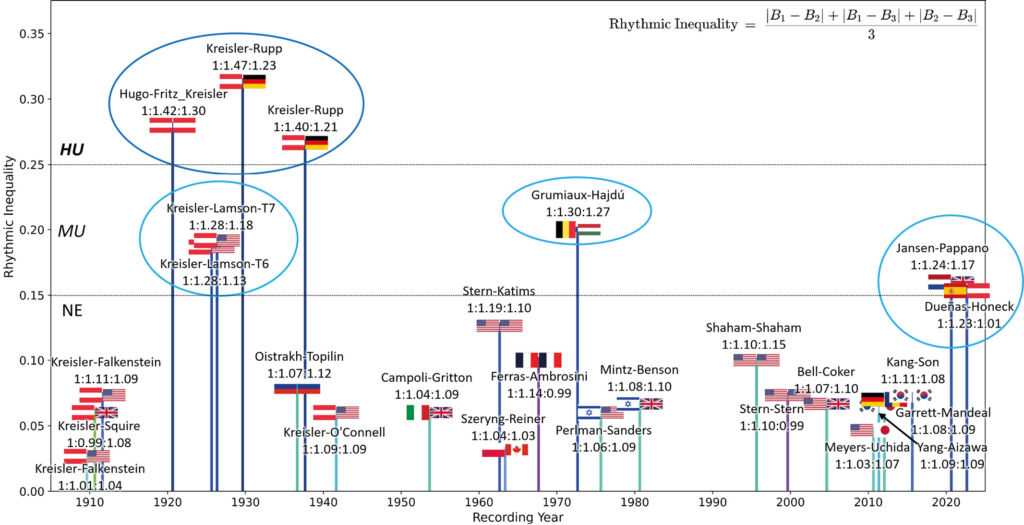 Abbildung 2 zeigt, dass – mit Ausnahme von Kreislers Aufnahmen zusammen mit seinem Bruder Hugo und dem deutschen Pianisten Franz Rupp – der „Wiener Rhythmus“ in der Aufnahme aus dem Jahr 1973 des belgischen Geigers Arthur Grumiaux mit dem Pianisten István Hajdú, geboren in Österreich-Ungarn, der Aufnahme aus dem Jahr 2021 der niederländischen Geigerin Janine Jansen und des englischen Pianisten/Dirigenten Antonio Pappano, der viele Jahre in Deutschland tätig war, sowie in der Aufnahme aus dem Jahr 2023 der in Österreich ausgebildeten spanischen Geigerin María Dueñas unter dem Dirigat des österreichischen Dirigenten Manfred Honeck mit den Wiener Symphonikern besonders stark ausgeprägt ist. Alle diese Aufnahmen stehen in direktem oder indirektem Zusammenhang mit der österreichisch-deutschen Musikkultur. Im Gegensatz dazu scheint der historische Faktor eine geringere Rolle zu spielen. So weist beispielsweise Kreislers früheste Aufnahme von 1910 mit dem Pianisten George Falkenstein den geringsten „Wiener Rhythmus“ auf, und die Aufnahme aus dem Jahr 1937 von David Oistrach und Vselovod Topilin weist deutlich weniger rhythmische Ungleichheit im Vergleich zu Kreislers eigenen Aufnahmen mit Rupp aus derselben Zeit auf.