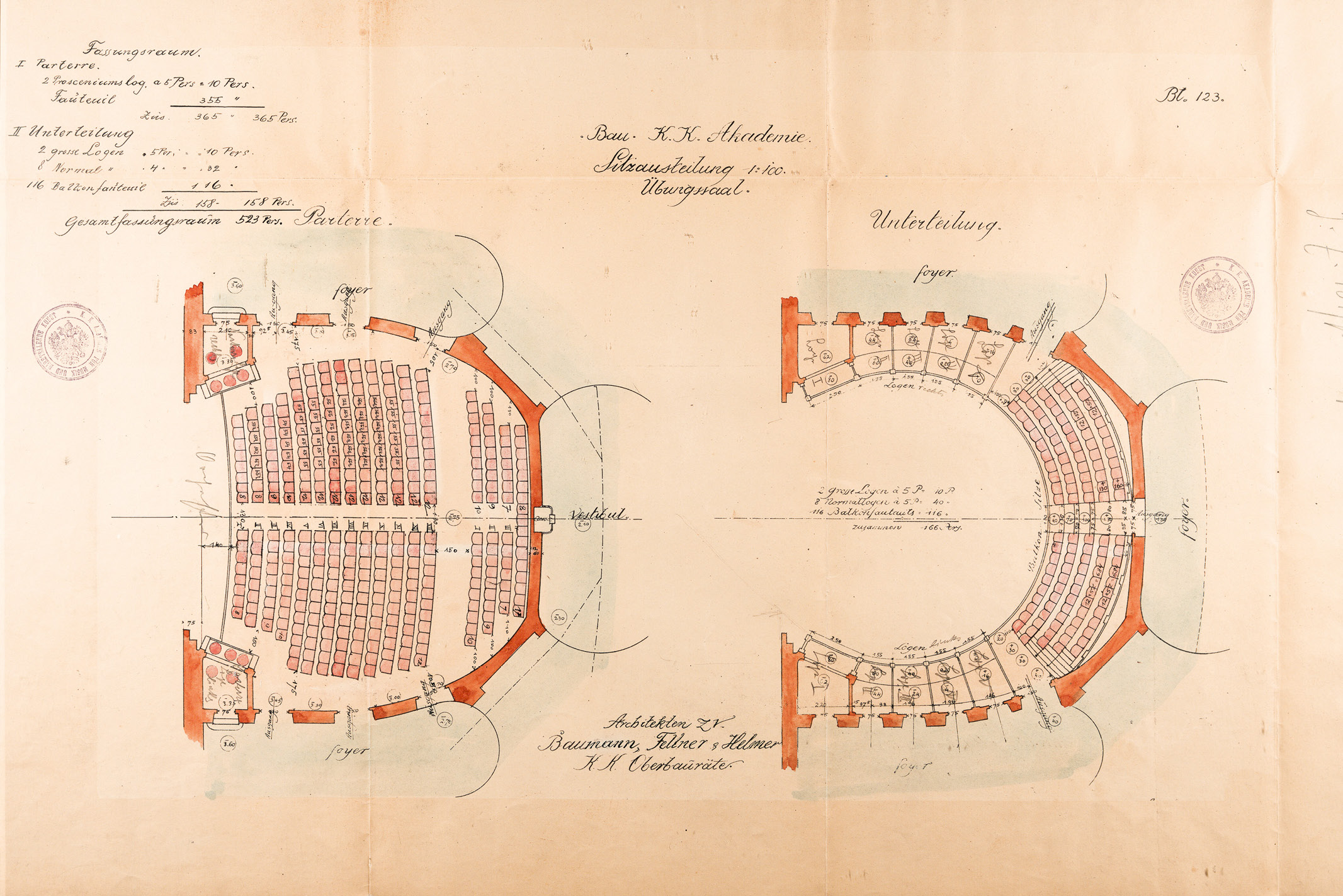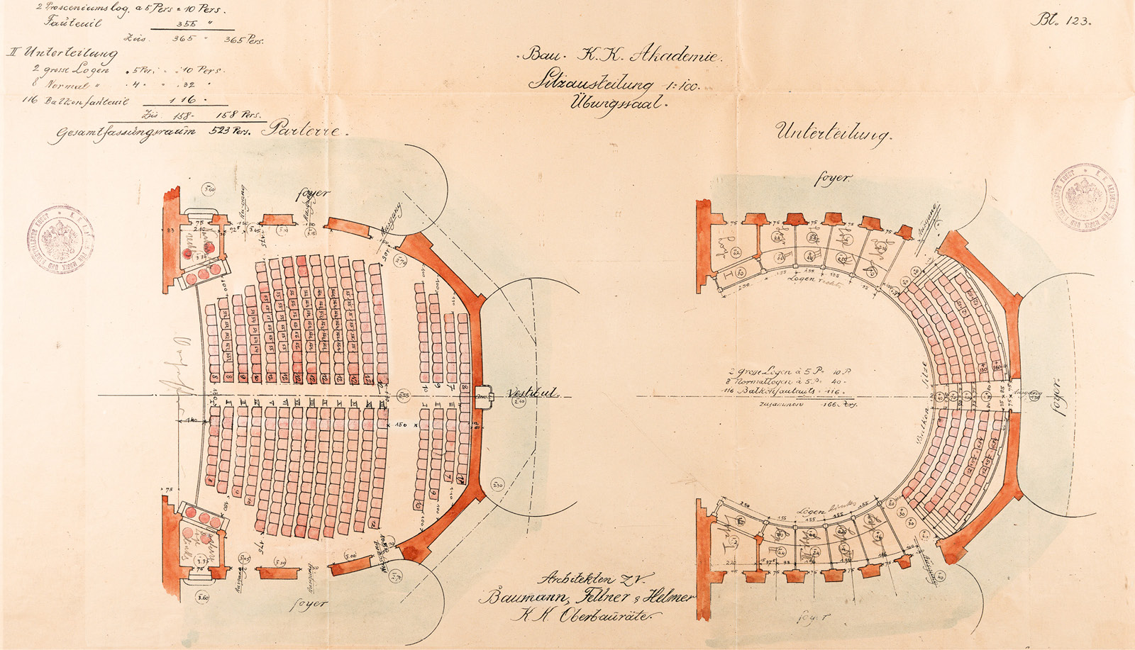 [Ich kann nicht] umhin, darauf hinzuweisen, dass der nach dem vorgelegten Projekte im Akademietrakte unterzubringende Übungssaal für dramatische und musikalische Aufführungen, welcher ja nicht täglich von der kaiserlich-königlichen Akademie in Anspruch genommen wird, eine nicht unergiebige Einnahmensquelle für den Staat darstellen wird. […] Es ist […] zu hoffen, dass die Hoftheater, bei welchen schon längst das dringende Bedürfnis nach einer kleinen, für intime Wirkungen berechneten Bühne besteht, diesen Übungssaal für alle oder doch für einen großen Teil der verfügbaren Abende mieten werden.2