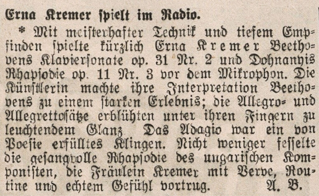 The earliest traces of public appearances by Erna Kremer as a soloist, piano accompanist, and chamber musician date from the early 1920s, and one newspaper review also alludes to a tour in Sweden. By 1923, at the latest, she was heading a class of piano majors at the Neues Wiener Konservatorium and also teaching privately on the side. But despite how a concert review from that era prophesied that “this artist will soon be known as a piano virtuoso of continental rank,”2 Kremer did not succeed in building an international career. From the early 1930s onward, however, she did play for radio broadcasts—thereby becoming a nationally recognised name. And in 1934, Kremer was appointed to head a class of piano minors at the mdw, in which capacity she taught up to 70 students each semester.
