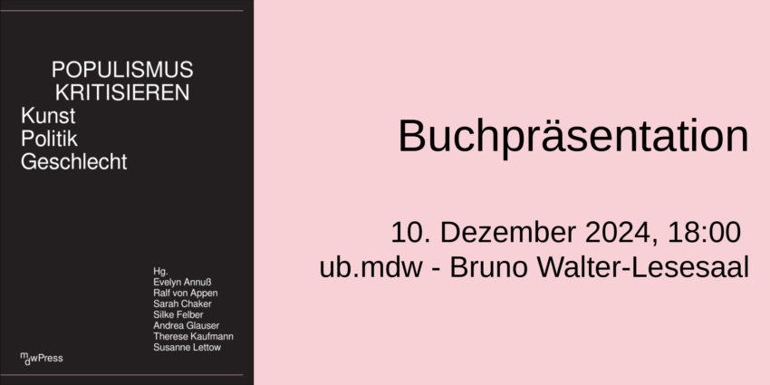 Populismus kritisieren – Aktuelle Perspektiven 10. Dezember 2024, 18:00 ub.mdw – Bruno Walter-Lesesaal Anton-von-Webern-Platz 1, 1030 Wien Rechtspopulistische Bewegungen und Diskurse greifen auf neue, ästhetisierte Politikstile und bis dato links konnotierte, künstlerisch erprobte Provokationsformen zurück. Zudem werden  Geschlecht, Familie und Sexualität als Triggerthemen besetzt. Der Band führt die  Populismusforschung mit geistes- und kulturwissenschaftlichen Perspektiven zusammen und nimmt das kulturelle Feld …