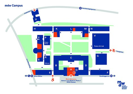 For orientation on the mdw campus, please take a look at the map below. For further information, please visit the mdw site: contact & locations.