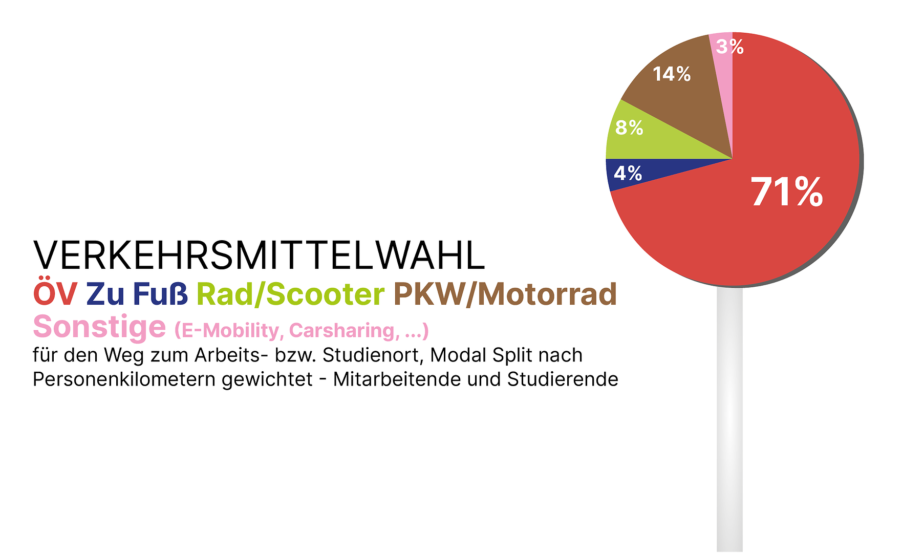Das Pendeln von Bediensteten und Studierenden ist für mehr als ein Drittel der Treibhausgasemissionen der mdw verantwortlich. Obwohl nur 14% des Pendelns (in Personenkilometer) mit PKWs zurückgelegt werden, verursachen diese fast ein Viertel (24,6%) der gesamten Treibhausgasemissionen der mdw. (Stand: Kennzahlen 2024)