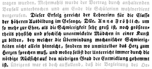 Es ist beispielsweise nachweisbar, dass sich Anna Fröhlich gegen eine Ausbildung der weiblichen Gesangsstimme vor dem 12. Lebensjahr aussprach. Das Alter der „Zöglinge“ und die Anzahl der Ausbildungsjahre waren wiederholt Themen des Führungs- und Lehrergremiums des jungen Konservatoriums, so wie auch eine noch zu entwickelnde einheitliche Methode, nach der der Gesangsunterricht erfolgen sollte, zur Diskussion stand (Hennenberg 2013, 364). Anna Fröhlich hatte weiters mit der Gruppengröße ihrer Gesangsklasse zu kämpfen, in der kein „Individualisieren [sic]“ möglich wäre (Hennenberg 2013, 366). Gruppenunterricht war nämlich der damalige Standard. Da Fröhlich in ihrer Klasse Mädchen bzw. junge Frauen unterrichtete, schien es ihren Zeitgenoss_innen aufzufallen, dass sie auf diese spezielle Situation frauenspezifisch einging, denn sie verstand es offensichtlich Alter und Entwicklungsstand sowie die körperliche Verfassung ihrer Schülerinnen zu berücksichtigen:„Dieser Erfolg [der Schülerin Francisca Goldberg] gereicht der Lehrerinn für die Classe der höheren Ausbildung im Gesang, Dlle. Anna Fröhlich, um so mehr zur Ehre, als die Schwierigkeit sehr groß ist, noch größtentheils physisch und psychisch unentwickelte Mädchen in einer Kunst zu bilden, bey welcher die Überwindung mechanischer Schwierigkeiten nicht allein hinreicht, sondern wo unmittelbar das Herz zum Herzen sprechen muß, und wobey selbst der Unterricht immer durch die nöthige Rücksicht auf den niedrigen Grad der Entwicklung gehemmt ist.“ (Conservatorium der Musikfreunde des österreichischen Kaiserstaates 1834, 389.)