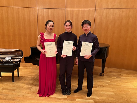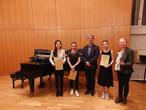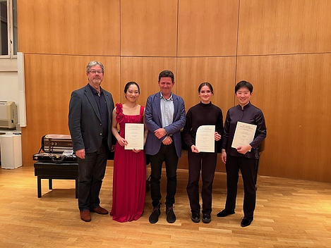 Winners of the Stefanie Hohl Competition 2025 Eva Ter-Sarkisova, Aijia Li and Eduard Steude with the chairman of the jury, Prof. Anton Sorokov and Sponsor Dr. Alfred Huber