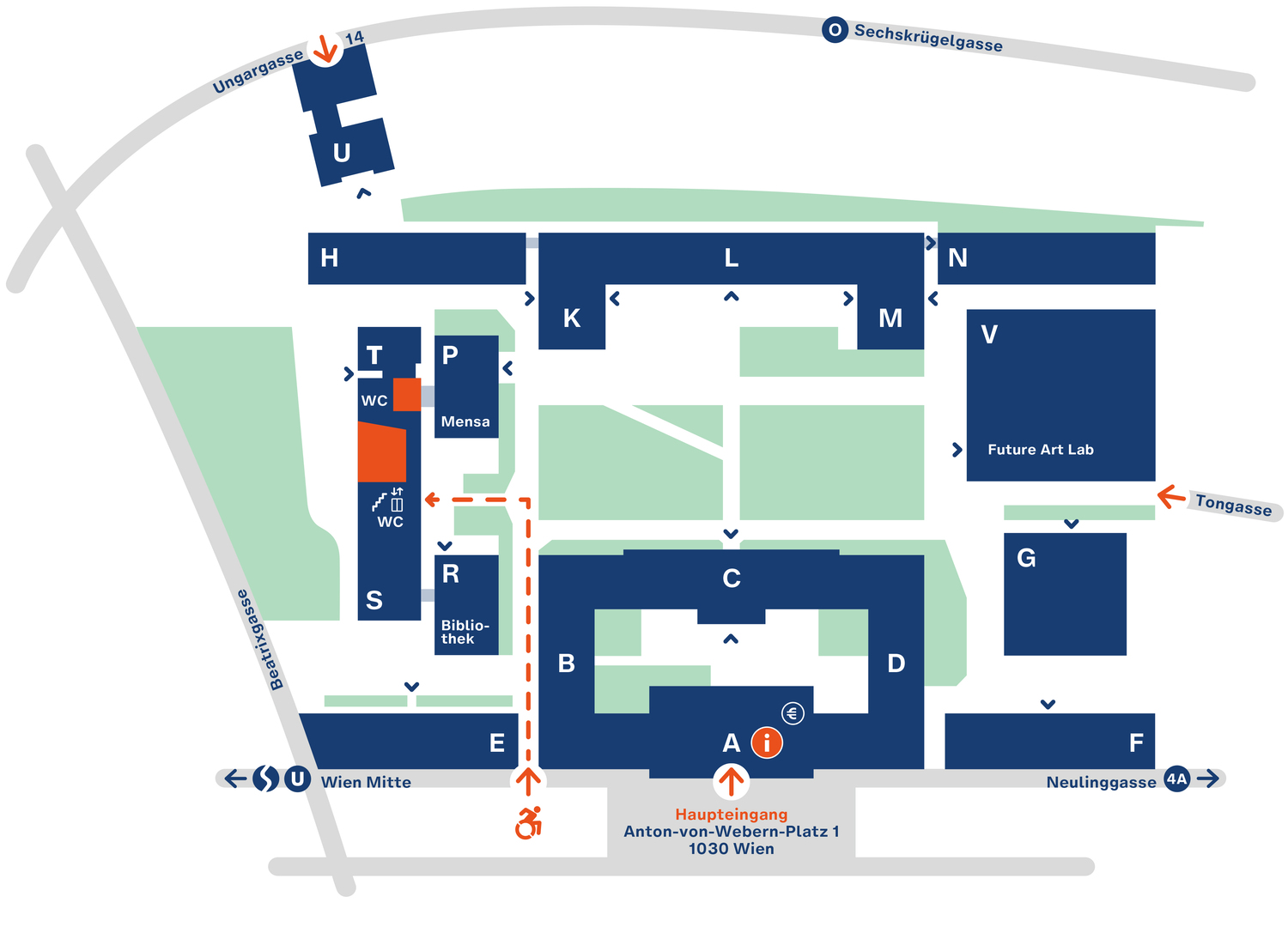 Die Büros der Personalentwicklung - Zentrum für Weiterbildung sind am Campus, Anton-von-Webern-Platz 1, 1030 Wien, im Gebäudeteil T untergebracht:
